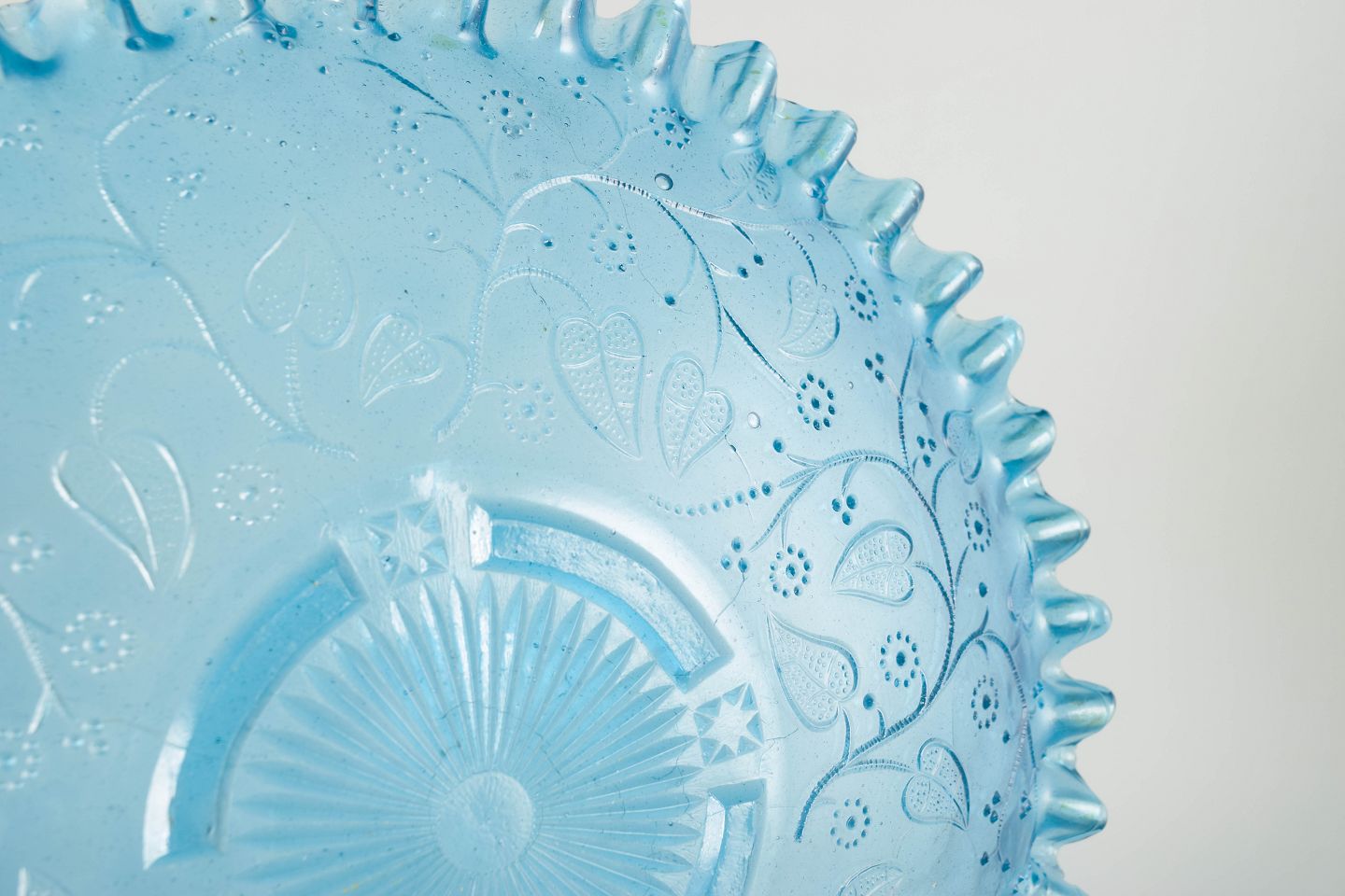 Dekorativt glasfad i lyseblå presset glas med bølget kant og indpresset blomster- og rankemønster. Et typisk eksempel på nordisk glasproduktion fra perioden, hvor funktionelle hverdagsgenstande blev udformet med markant ornamental finesse.