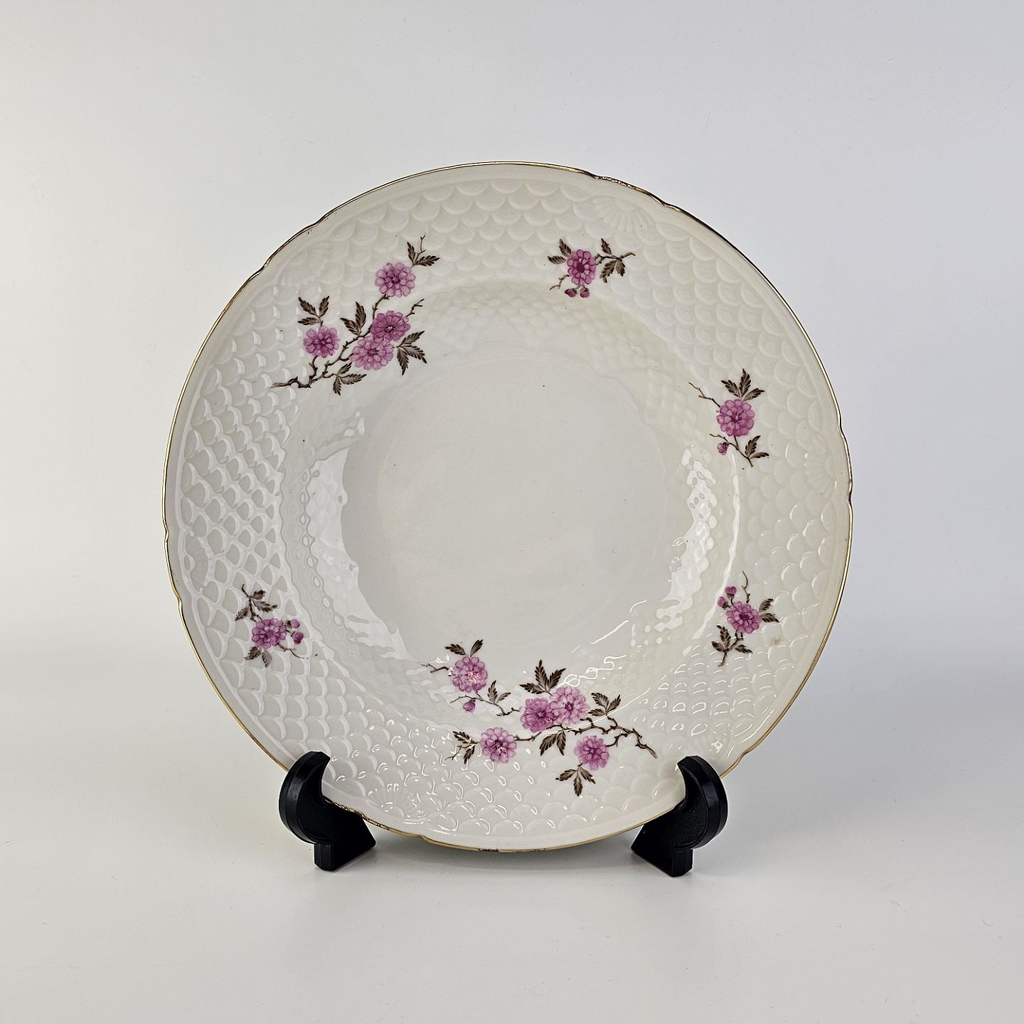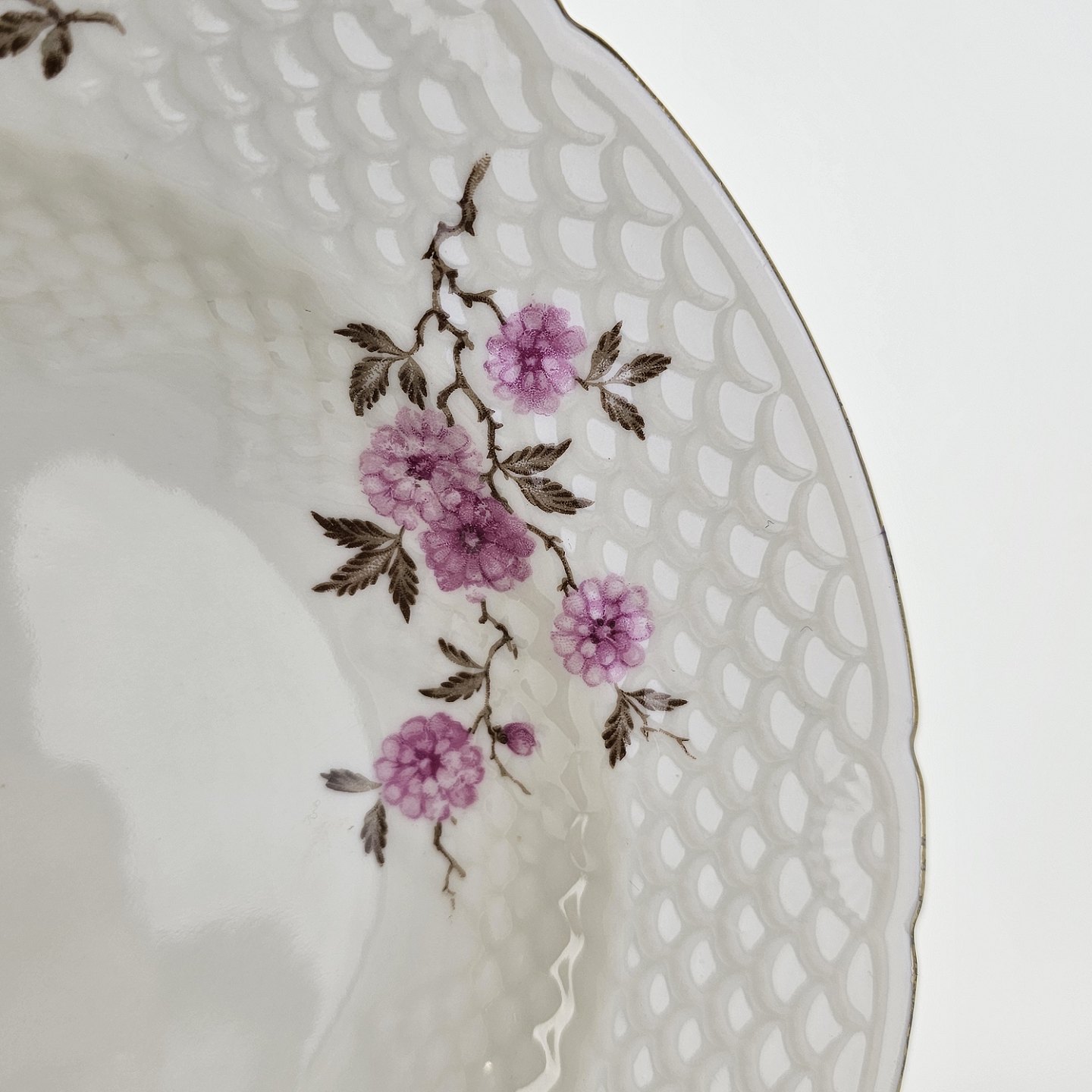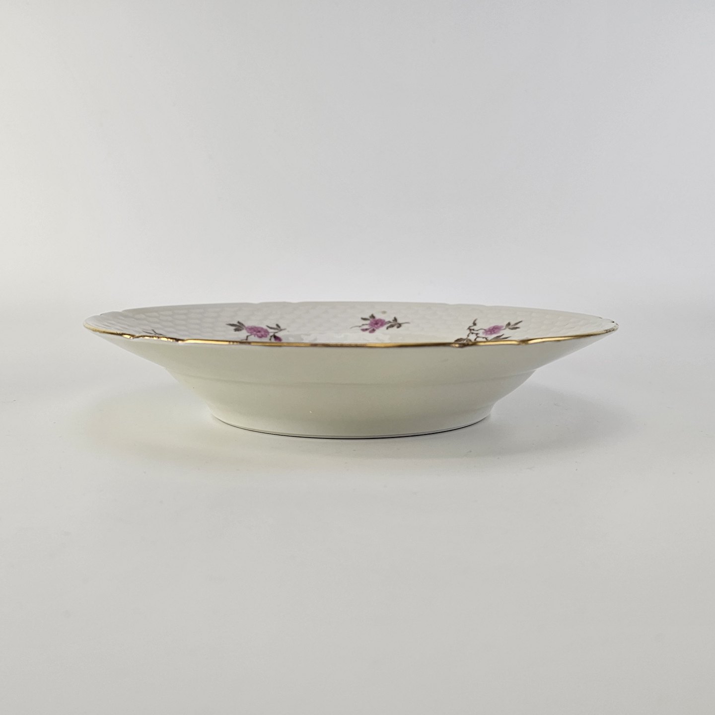 Volmer er porcelæn i skelform med guldkant og motiv af lyserøde blomster