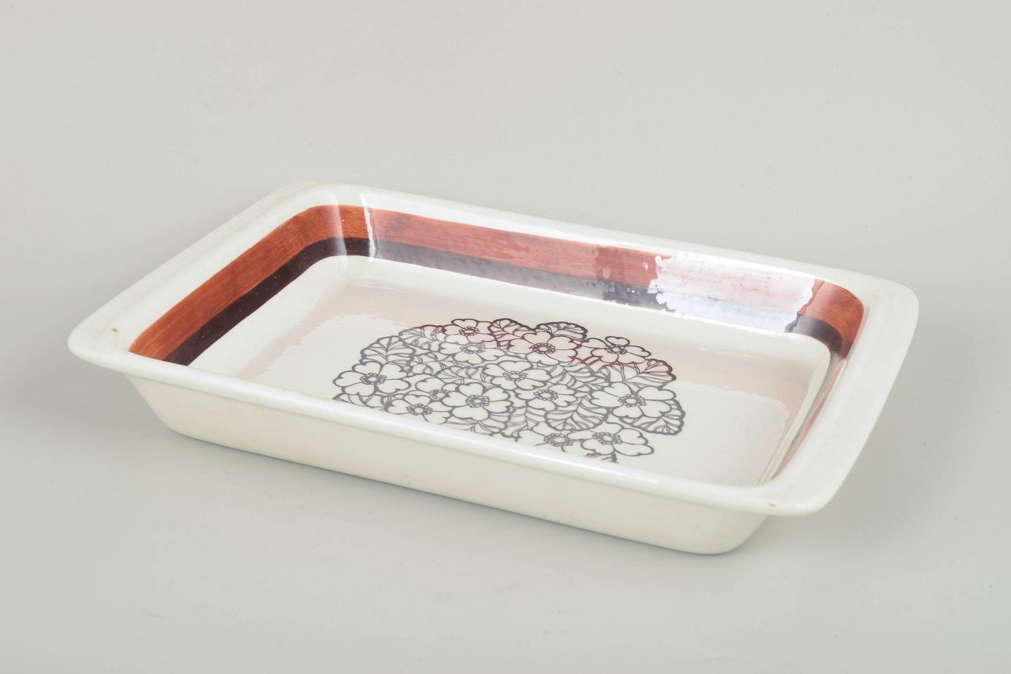 Rektangulært stentøjsfad med karakteristisk blomsterdekoration i brunlige og sorte toner, typisk for Gefles dekorative 70’er-udtryk.