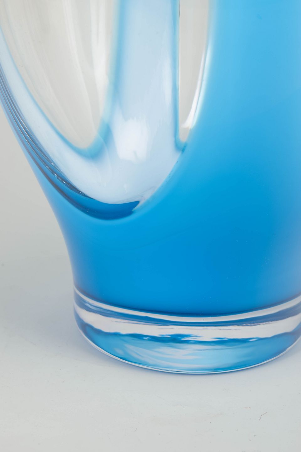 Imponerende, skulpturel kunstglas vase fra Kosta, udført i kraftigt lagdelt glas med markant optisk effekt. Den elegante, organiske profil kombineret med den klare og blåtonede glasmasse giver et stærkt moderne udtryk.