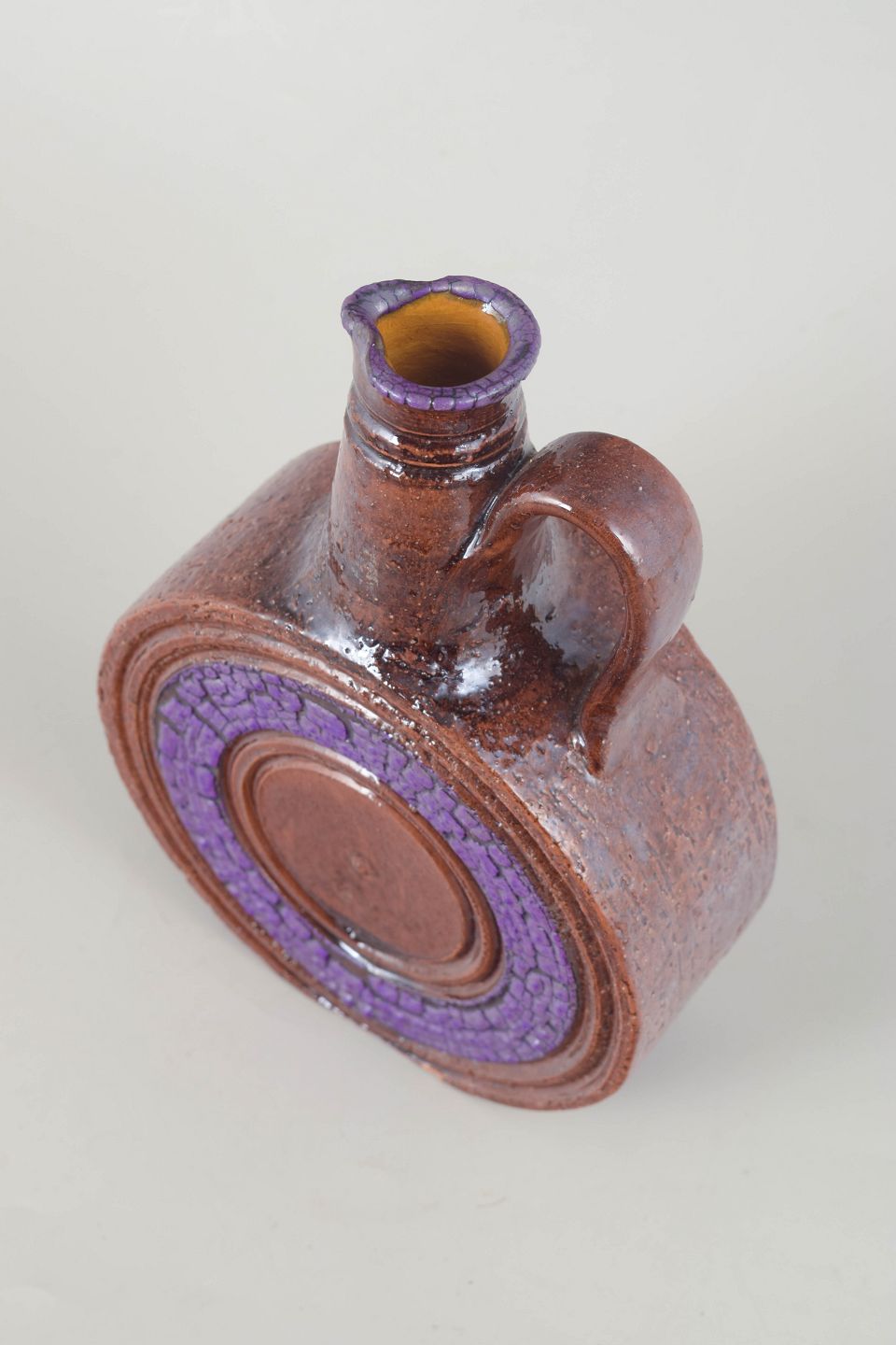 Dekorativ italiensk vin-karafel i glaseret terracotta med karakteristisk cirkulær reliefdekoration og lilla glasur i midterfeltet. Den organiske form, hankens bløde kurve og de stærke farver giver et klassisk Bitossi-udtryk fra perioden.