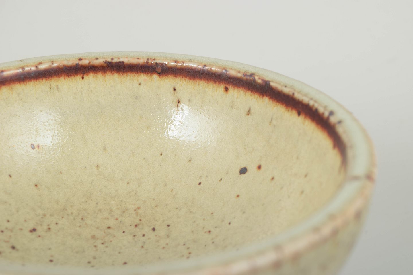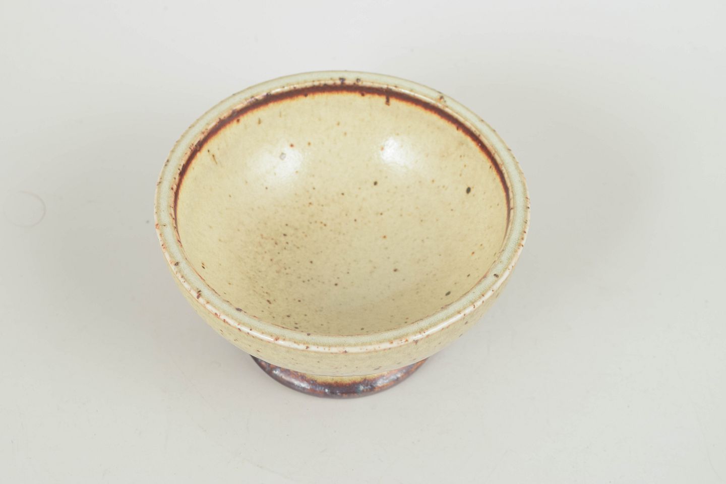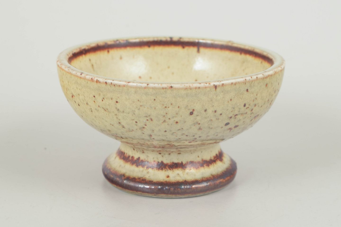 Drejet stentøjsskål med fod og en varm, plettet lys glasur med brunlige detaljer, typisk for Drejargruppens håndværksprægede udtryk i 1970’erne.