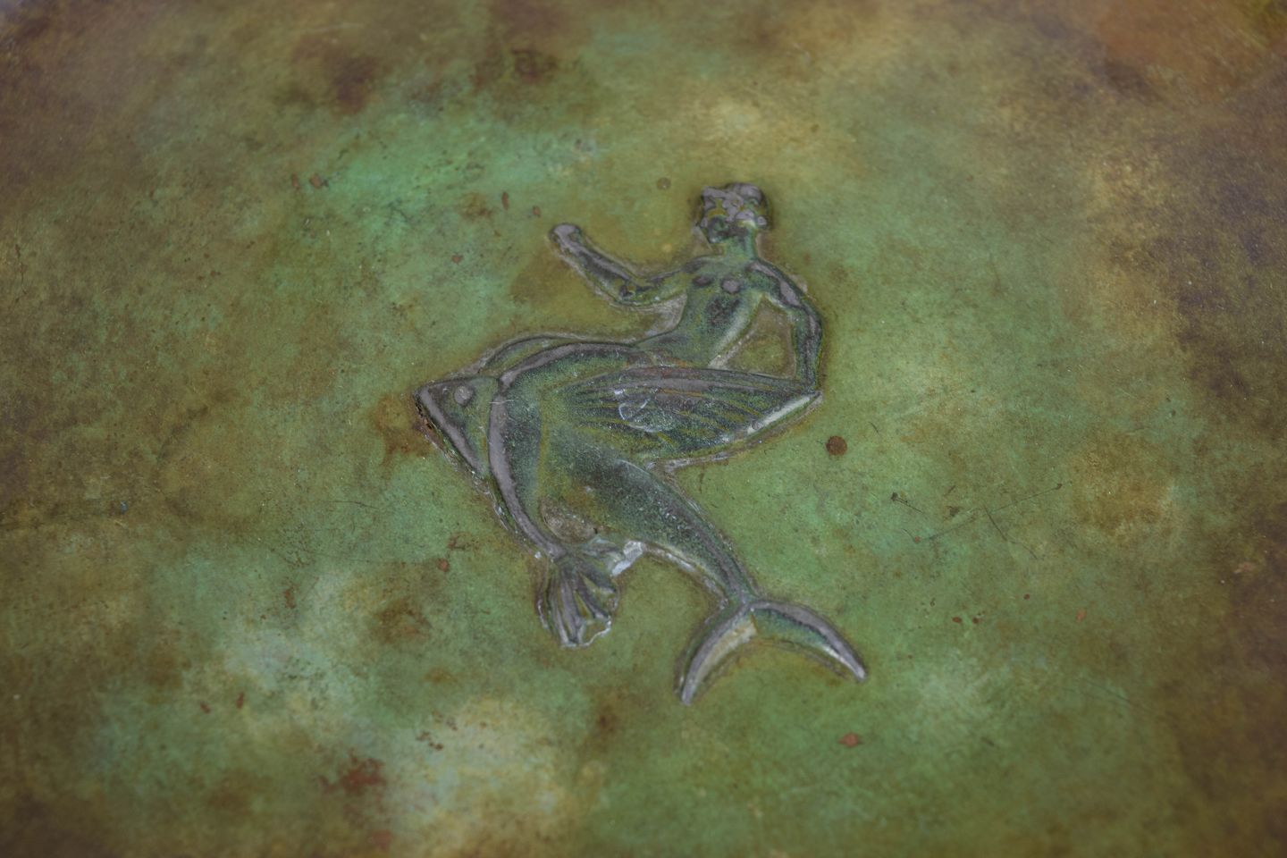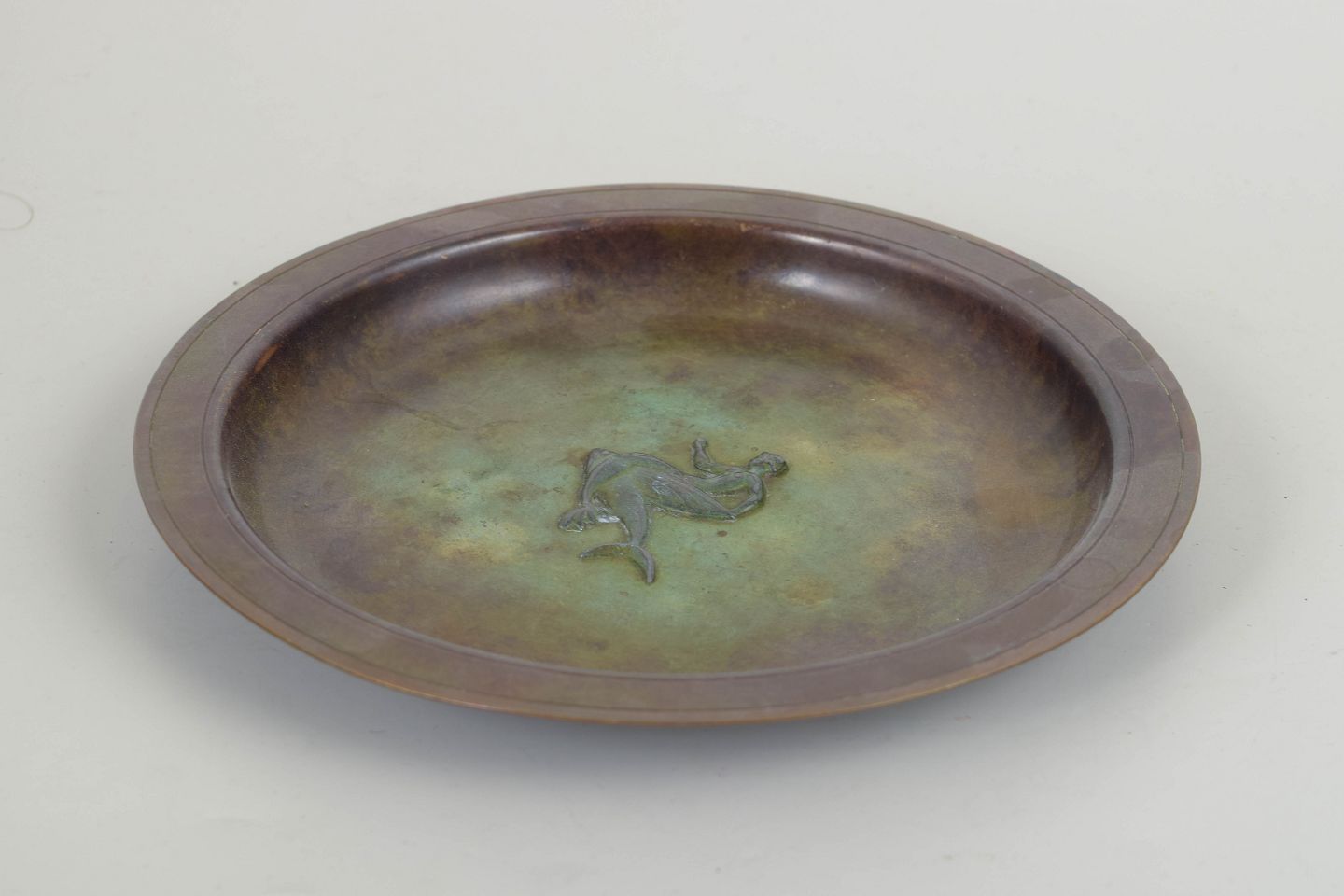 Rund art deco-skål i patineret bronze med centralt reliefmotiv af en siddende figur, udført i Just Andersens karakteristiske LB-legering. Den grønbrune patina giver formen en dyb, levende overflade, typisk for værkstedets dekorative metalarbejder.