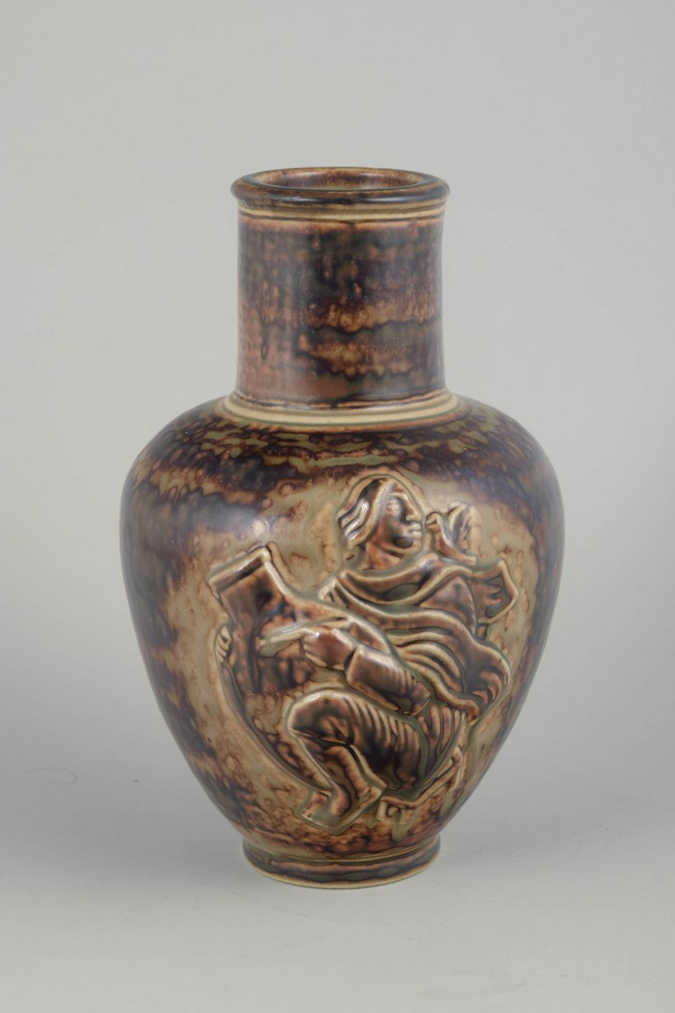 Skulpturelt dekoreret vase i den karakteristiske Sung-glasur, med reliefmotiv af figurativ scene. Den varme, løbende glasur fremhæver de plastiske detaljer og giver værket et markant, næsten metallisk skær.