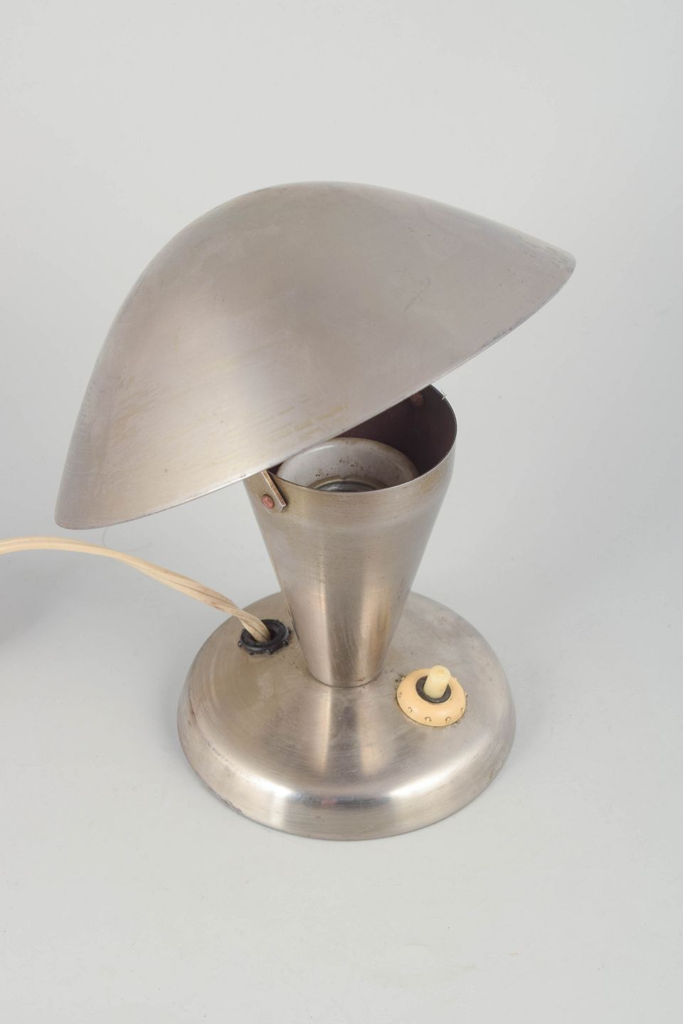 Tidlig modernistisk bordlampe i børstet stål med svampeformet skærm og konisk fod. Et karakteristisk eksempel på tjekkisk funktionalistisk belysningsdesign fra mellemkrigstiden, hvor rene linjer og industrielle materialer dominerede.