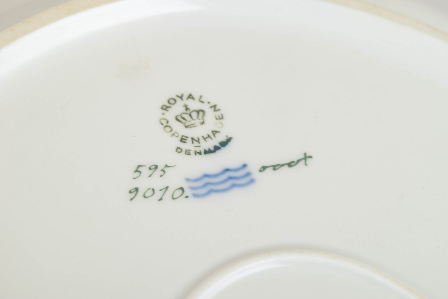 Imponerende stort ovalt serveringsfad i porcelæn fra Royal Copenhagens “Guldkurv”-serie, model 595/9010. Klassisk hvid porcelæn med bred forgyldt kant og det karakteristiske håndmalede blomsterkurvmotiv.