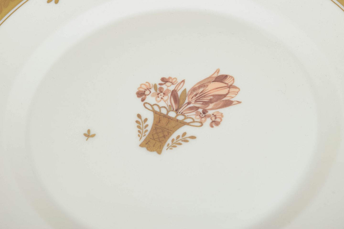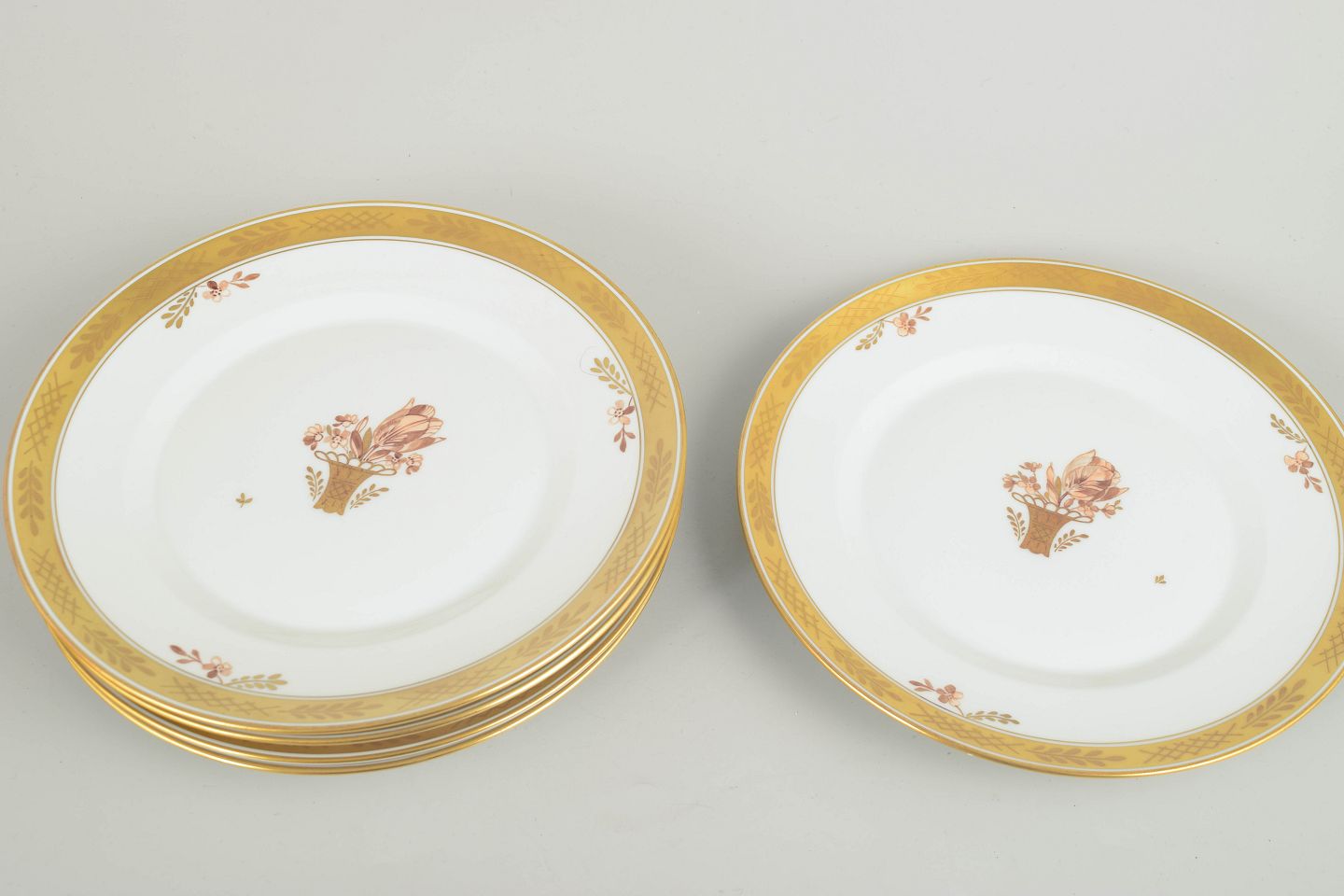 Sæt på fem elegante frokosttallerkener i porcelæn fra Royal Copenhagens “Guldkurv”-serie, model 595/9589. Klassisk hvid porcelænskvalitet med forgyldt kant og håndmalet blomsterkurvmotiv.