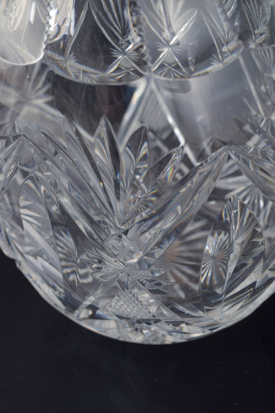 Elegant og solid kande i klart krystalglas med dybe slibninger i form af stjerne- og bladmotiver. Det tunge materiale og den markante dekoration giver kanden et klassisk, tidstypisk udtryk fra mellemkrigstiden.