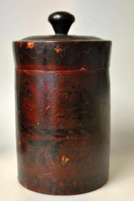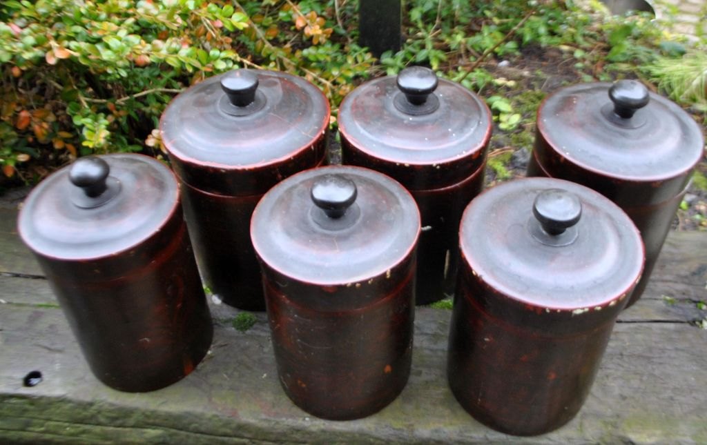 Samling russiske trædåser, 19. årh. Drejet og udhulet tre. Med udvendige bemalinger. Lakeret. Indvendig med sølvfarve.  I alt 5 stk.  NB: Sælges kun samlet!