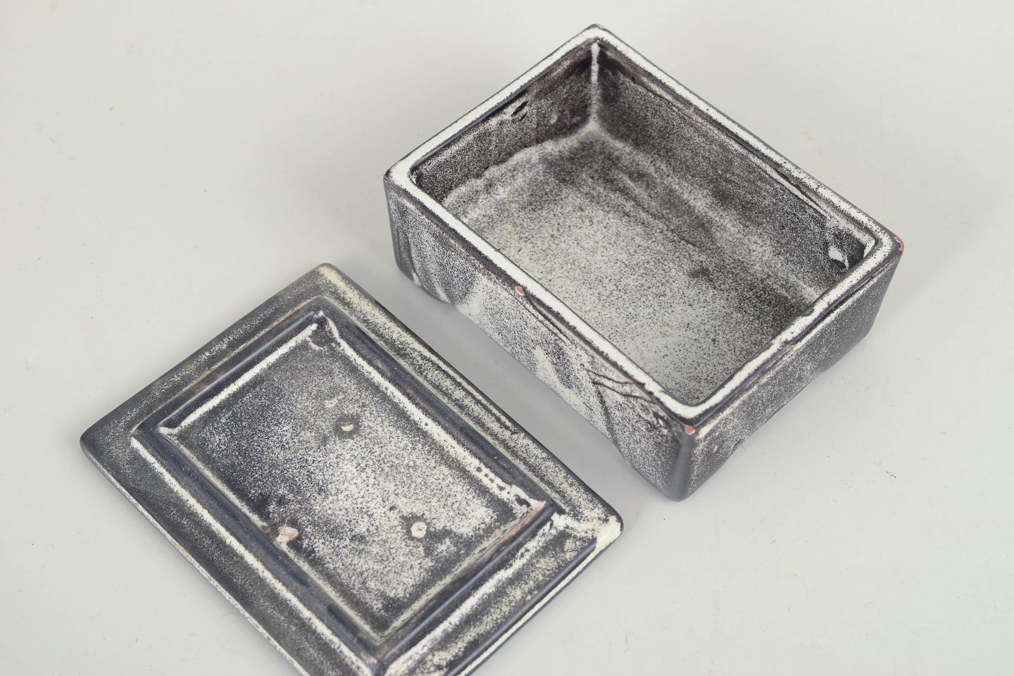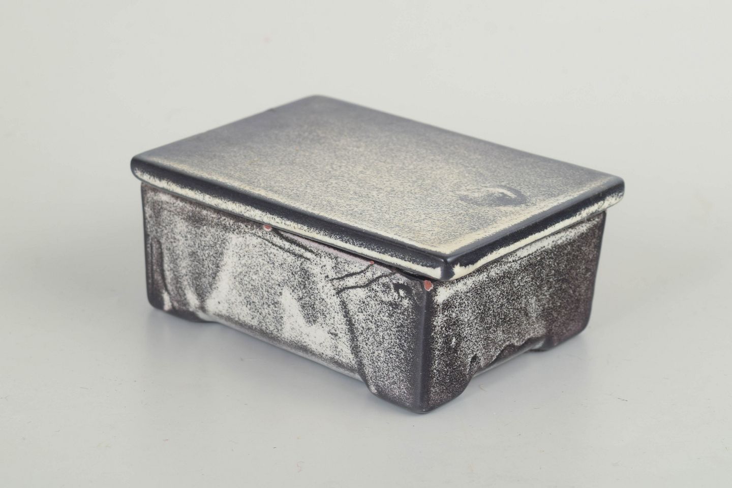 Rektangulær æske i stentøj med tilpasset låg, udført i en karakteristisk grå/sort dobbeltglasur med let metallisk virkning. Den stramme, arkitektoniske form og den stoflige glasuroverflade er typisk for Svend Hammershøis arbejder for Kähler i mellemkrigstiden, hvor funktion og æstetik forenes i en afdæmpet, tidløs helhed.