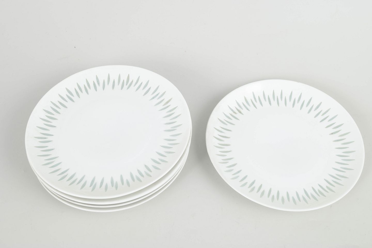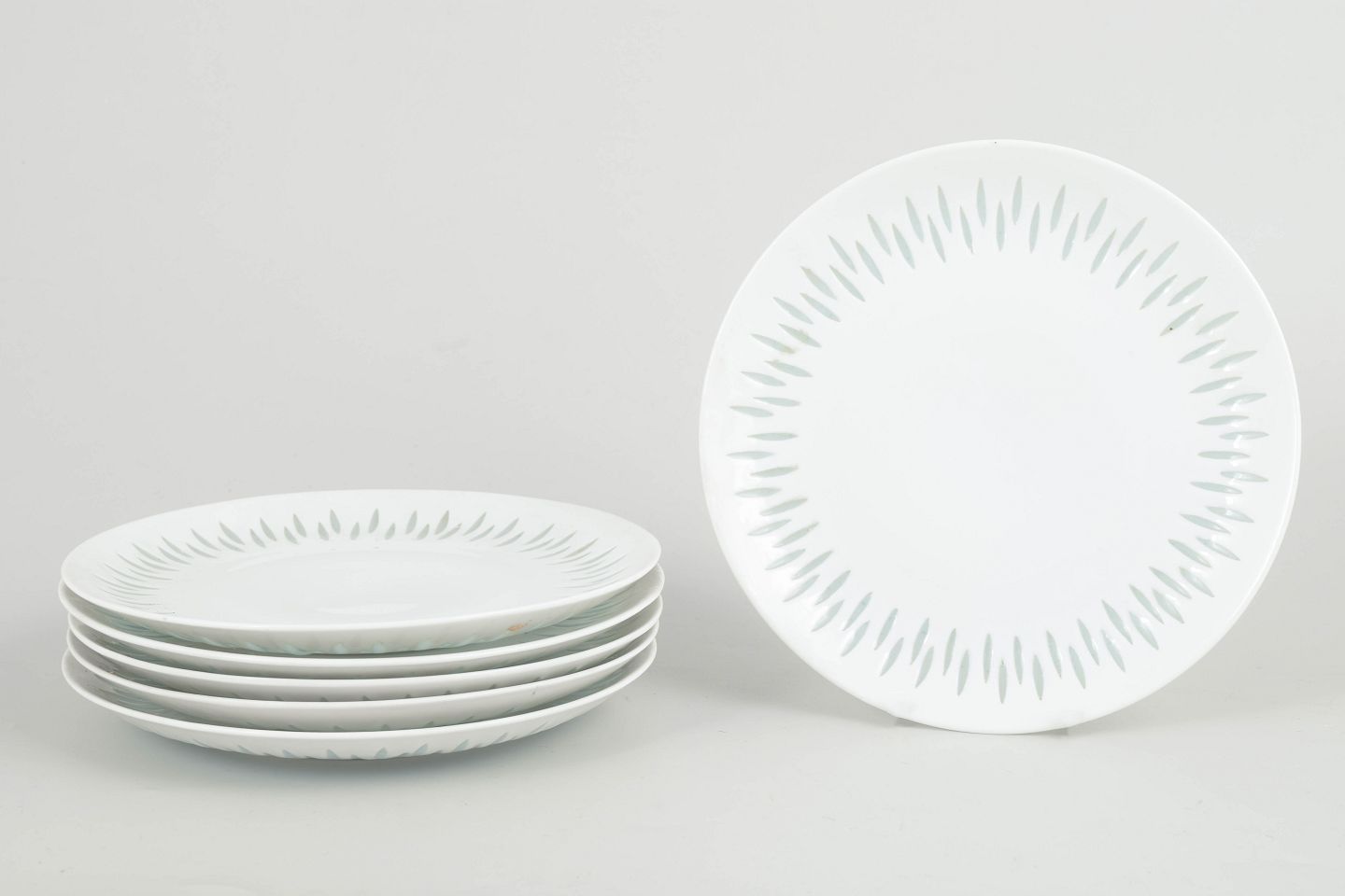 Sæt bestående af seks tallerkener i hvidt porcelæn dekoreret med karakteristisk “rice porcelain”-ornamentik langs fanen. De aflange, transparente glasurfelter danner en let og rytmisk bort, som giver tallerkenerne et elegant og luftigt udtryk. Det enkle formsprog er typisk for Friedl Holzer-Kjellbergs sene porcelænsdesign for Arabia.