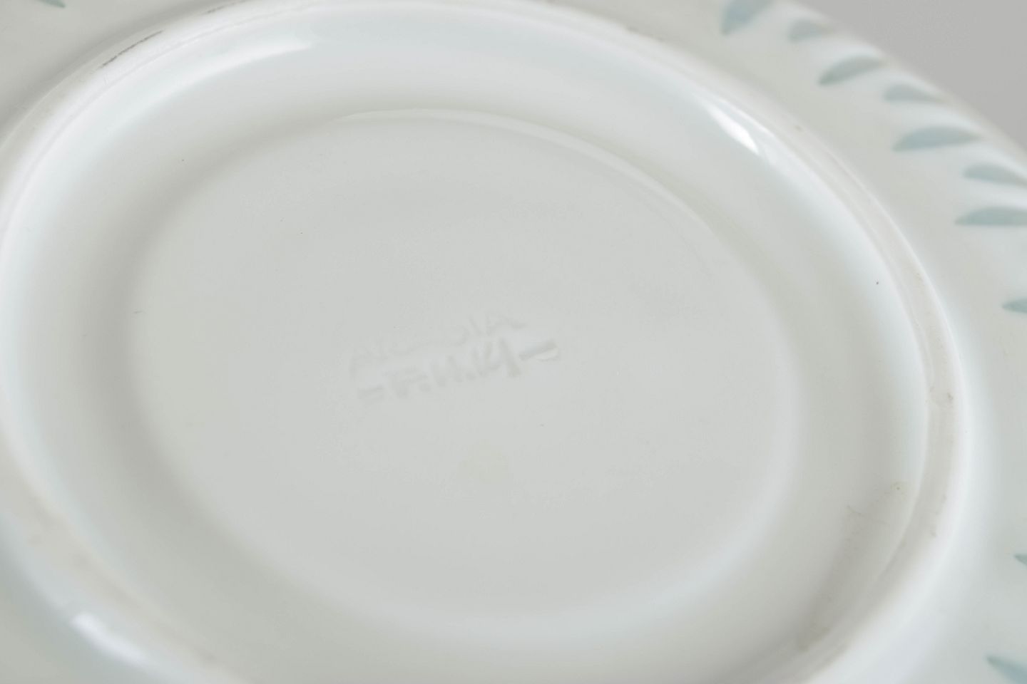 Sæt bestående af fire tekopper med tilhørende underkopper i hvidt porcelæn med gennembrudt “rice porcelain”-dekoration. De aflange perforeringer udfyldt med transparent glasur giver porcelænet et let og næsten translucent udtryk, mens de enkle, afrundede former er karakteristiske for Friedl Holzer-Kjellbergs sene modernistiske porcelænsdesign for Arabia.