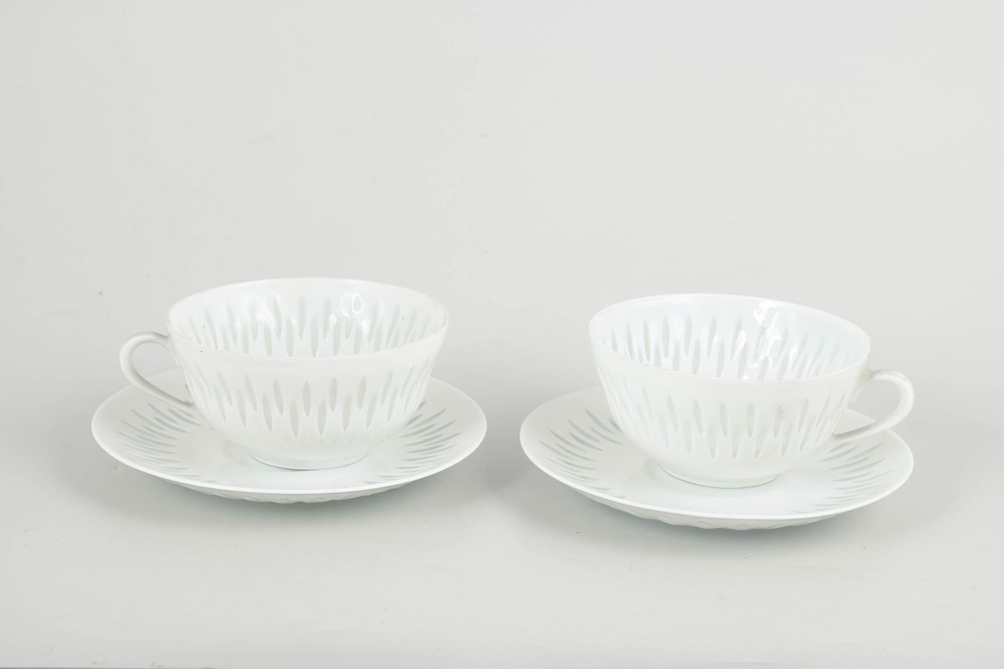 Sæt bestående af to tekopper med tilhørende underkopper i hvidt porcelæn med gennembrudt “rice porcelain”-dekoration. De aflange perforeringer udfyldt med transparent glasur skaber et let og næsten translucent udtryk, mens de enkle, afrundede former er karakteristiske for Friedl Holzer-Kjellbergs sene modernistiske porcelænsdesign for Arabia.