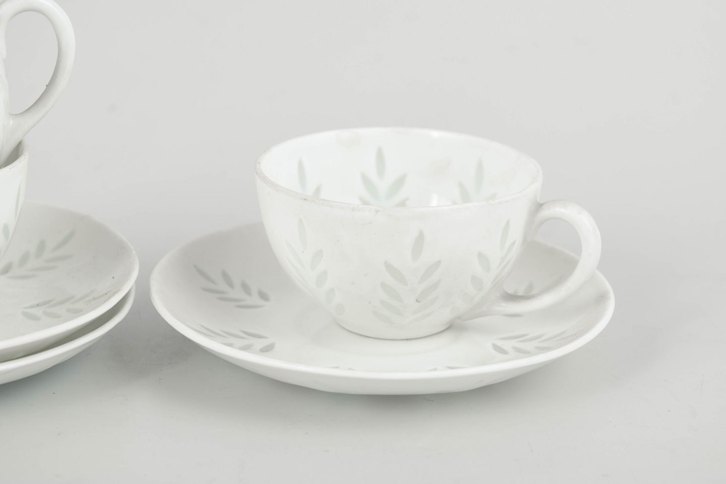 Elegant sæt bestående af tre mokkakopper med tilhørende underkopper i hvidt porcelæn, dekoreret med diskret bladornamentik udført i transparente, let grønligt tonede glasurfelter. Det lette og raffinerede udtryk samt de bløde, harmoniske former er karakteristisk for Friedl Holzer-Kjellbergs sene porcelænsdesign for Arabia.