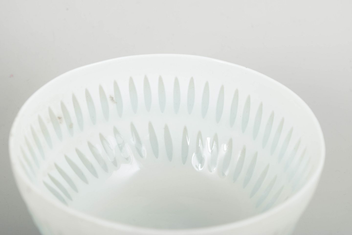 Sæt bestående af tre små skåle i hvidt porcelæn med gennembrudt og præget dekoration i klassisk “rice porcelain”-udtryk. De fine perforeringer og transparente glasurfelter giver skålene et let og næsten translucent præg, mens de enkle, koniske former understreger Friedl Holzer-Kjellbergs raffinerede modernistiske formsprog.