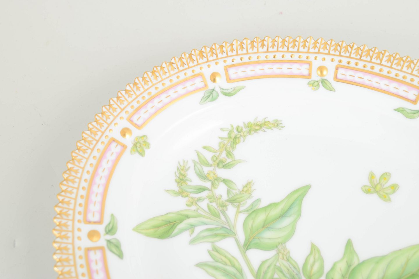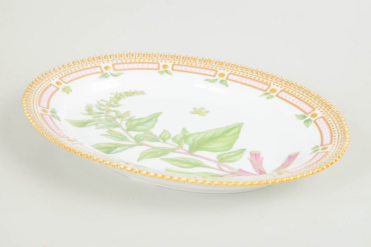 Oval serving dish from the Flora Danica series, decorated with a hand-painted botanical motif based on original engravings from the Flora Danica publication. Made in white porcelain with a finely pierced border and gilt detailing in gold and soft pink tones. A classic serving form from Royal Copenhagen’s late 20th-century production.