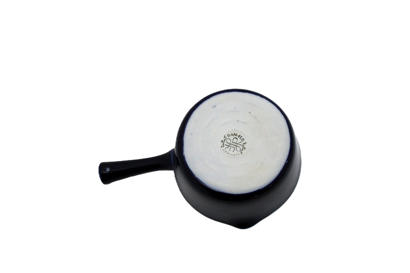 Text available in Danish: Lille smørnæb, kasserolle, Blå glasurfarver 2600, Lyngby