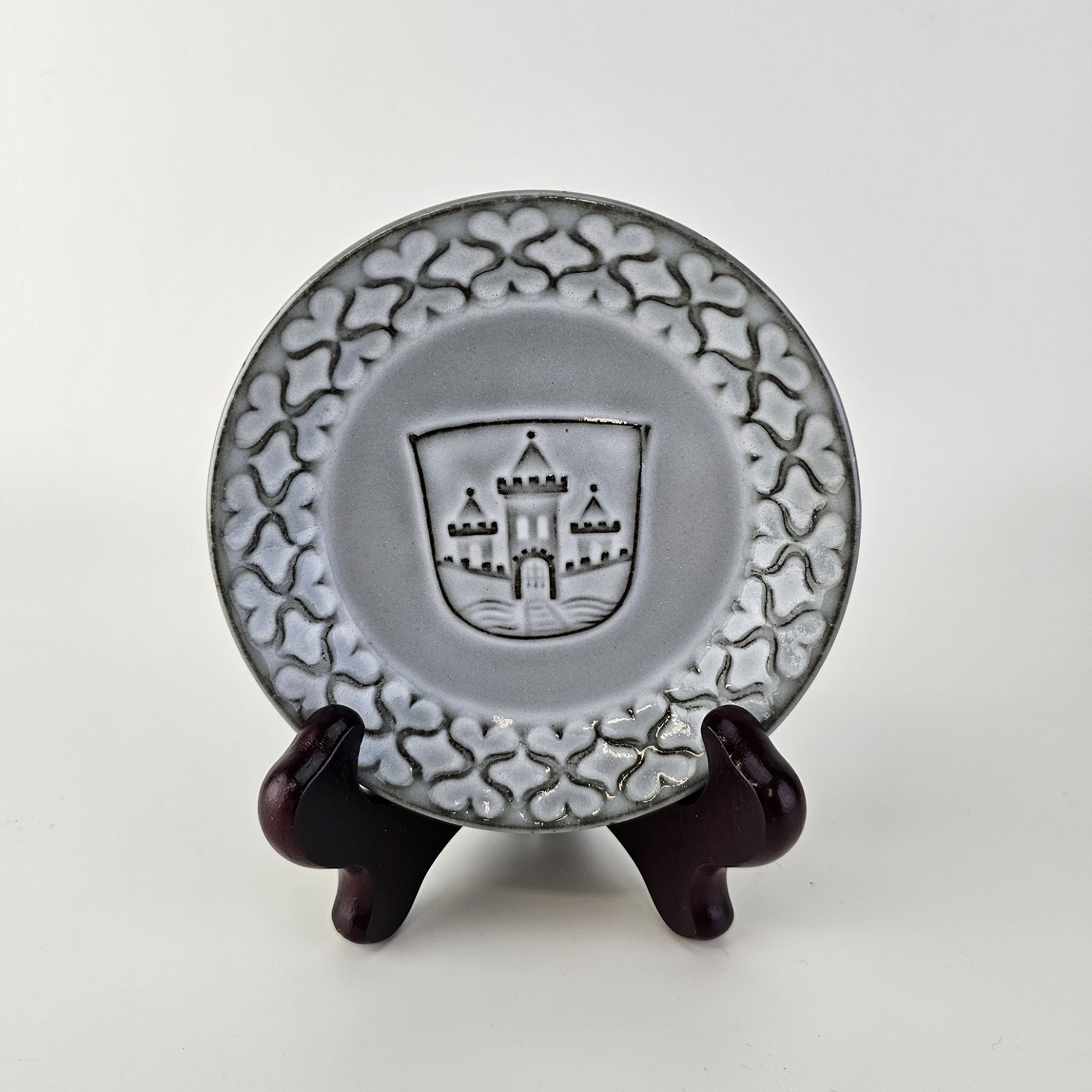 Kuvert askebægre af stentøj fra stellet Grå Cordial, med Randers Byvåben