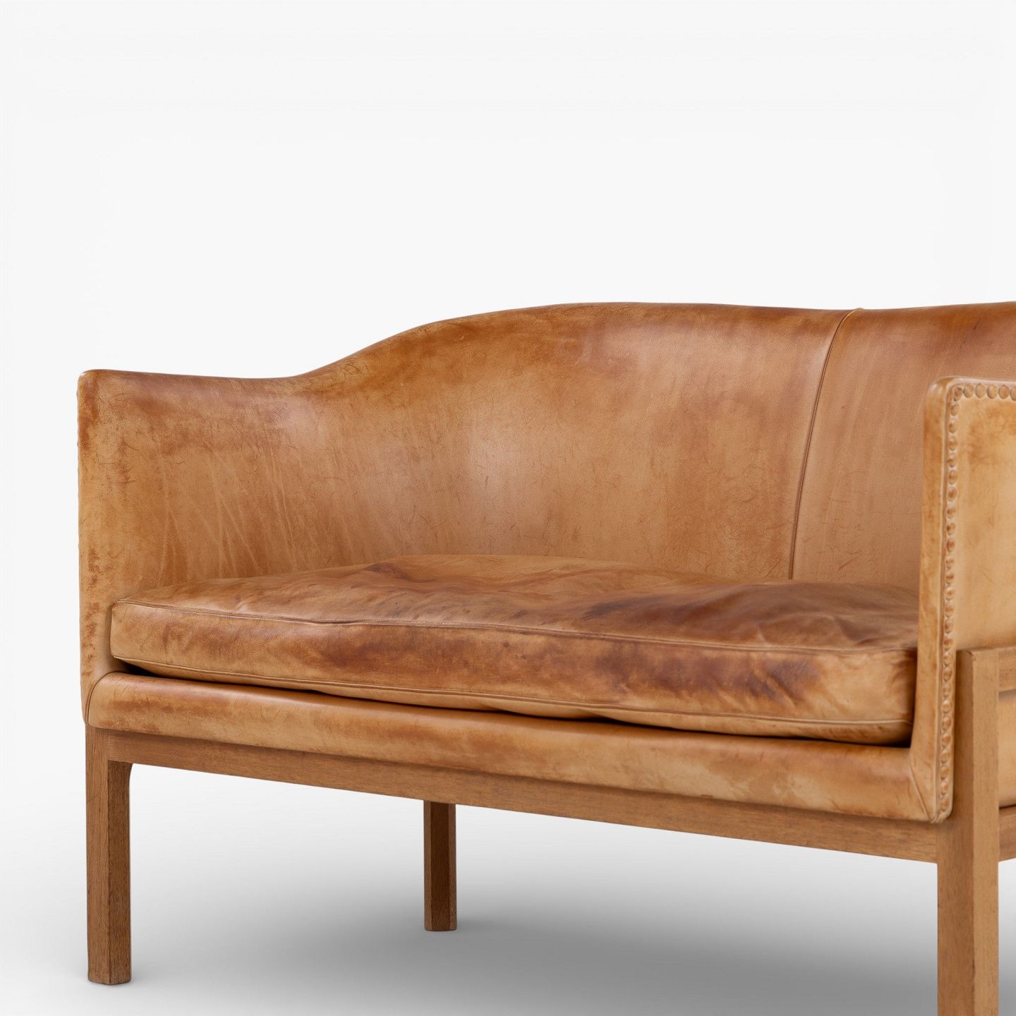 MK 52/2 - 2 pers. sofa i patineret sømbeslået naturlæder med stel i mahogni.