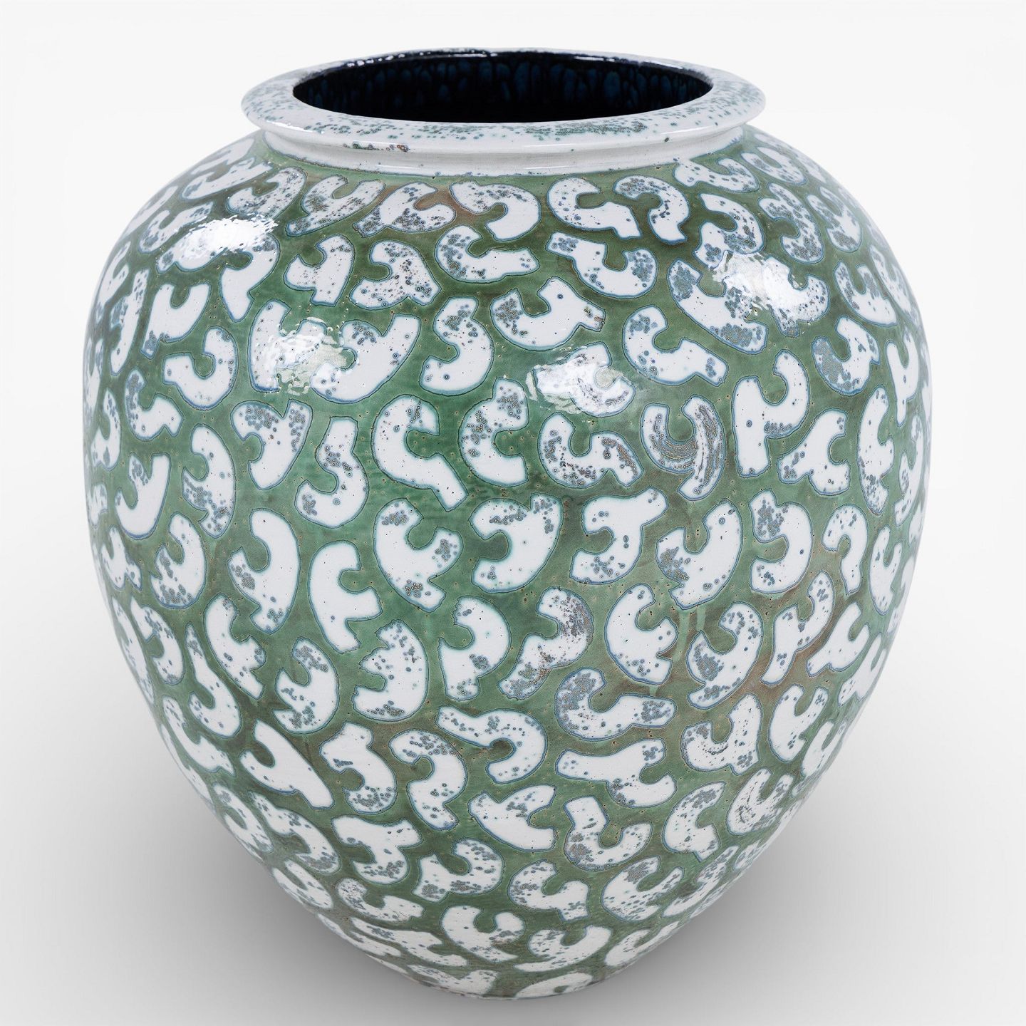 Kolossal krukke i stentøj med grøn glasur og hvide stafferinger. Signeret.