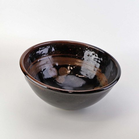 Skål i stentøj med delvist nubret glasur i brunlige nuancer og cirkelformet mønster i bunden.
