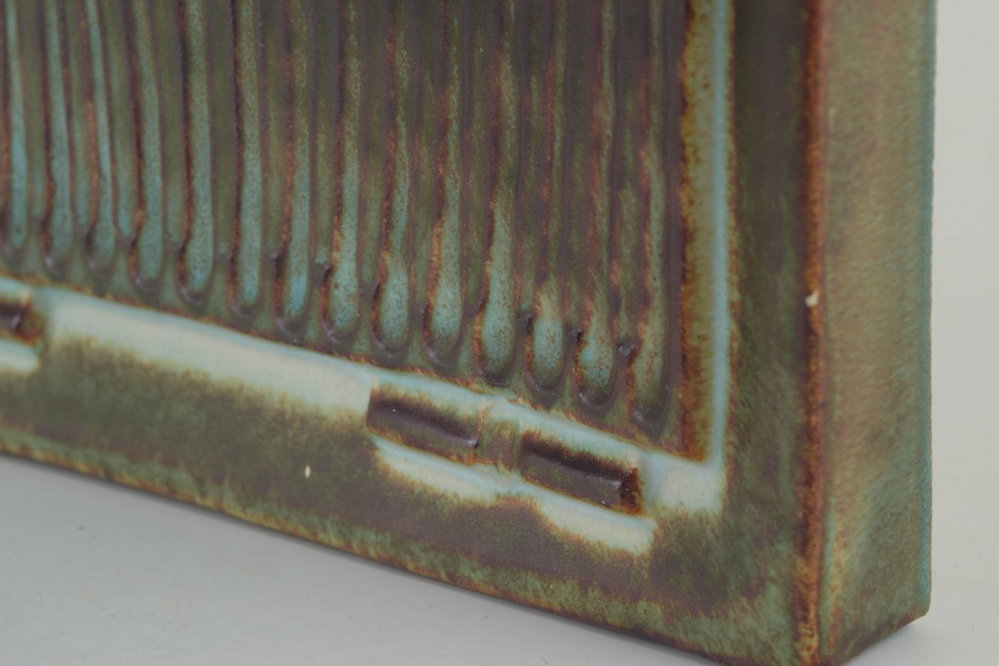 Relief i stentøj med stiliseret dyremotiv i lavt relief, udført i karakteristisk nordisk formsprog. Glasur i dæmpede jordtoner med grønne og brune nuancer, typisk for Höganäs’ produktion i perioden.