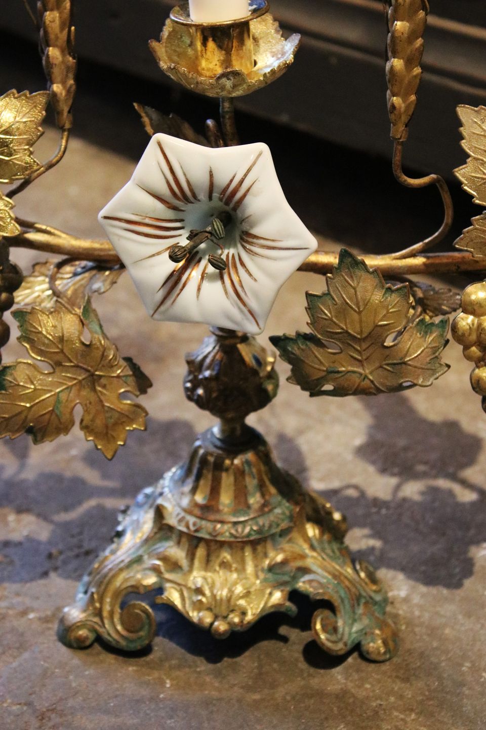 Lysestagen er dekoreret med 1 stor fin hvid porcelæns blomst , drueklaser , vinblade , kornneg og lilje blomster i bronze.