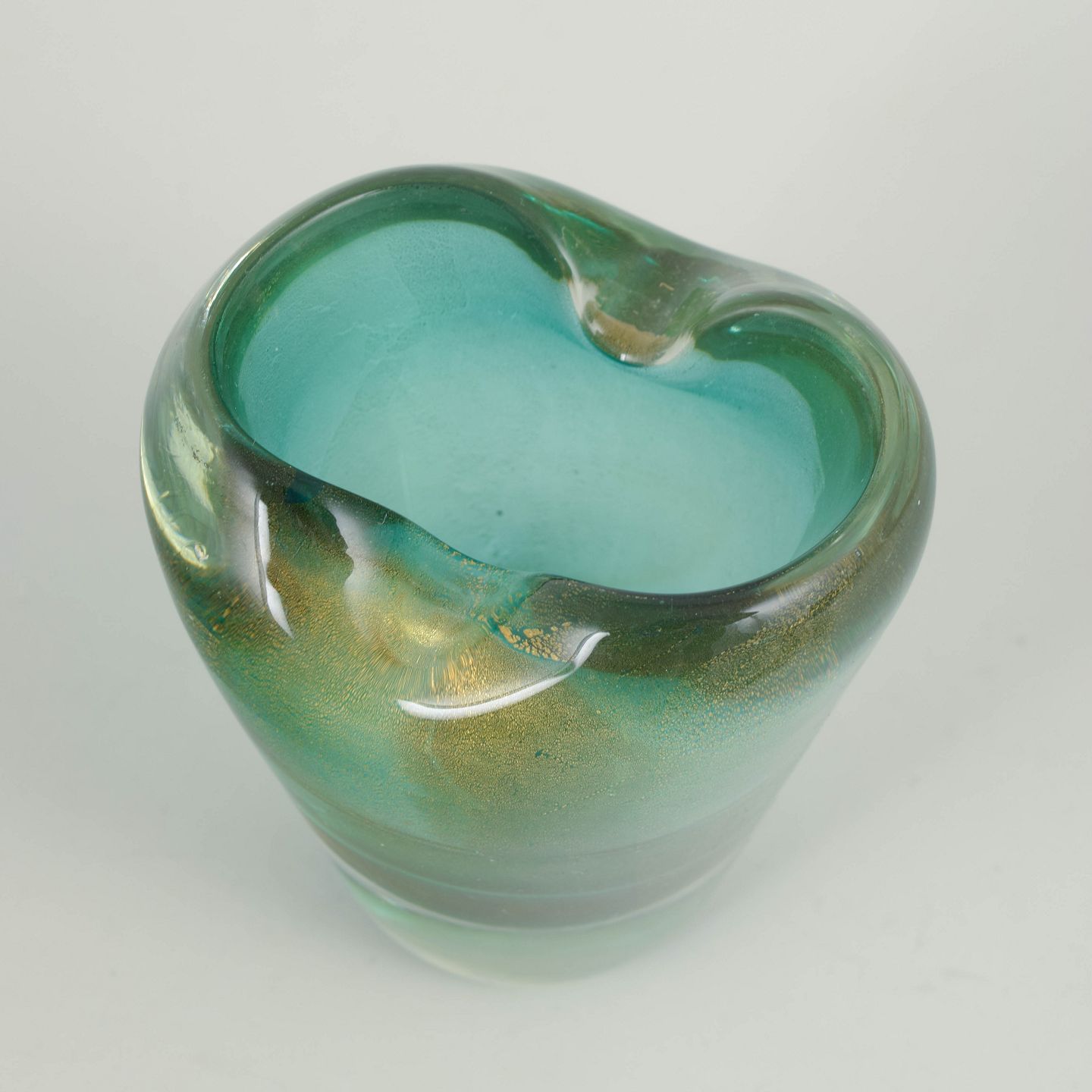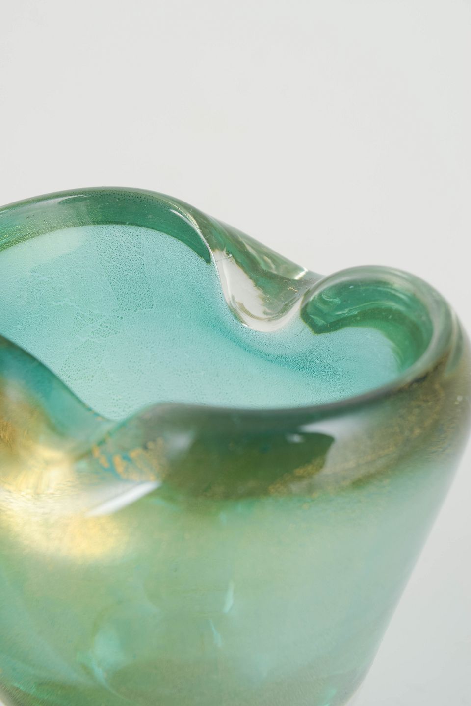 Skulpturel vase i mundblæst kunstglas med fri, organisk åbning og let asymmetrisk kant. Glasset fremstår i klare turkisgrønne nuancer med gyldne indeslutninger, der giver dybde og et blødt, levende farvespil. Den massive, klare fod danner en stabil base og kontrasterer elegant mod den farvede overdel. Formen og materialebehandlingen er karakteristisk for muranesisk kunstglas fra midten af det 20. århundrede.