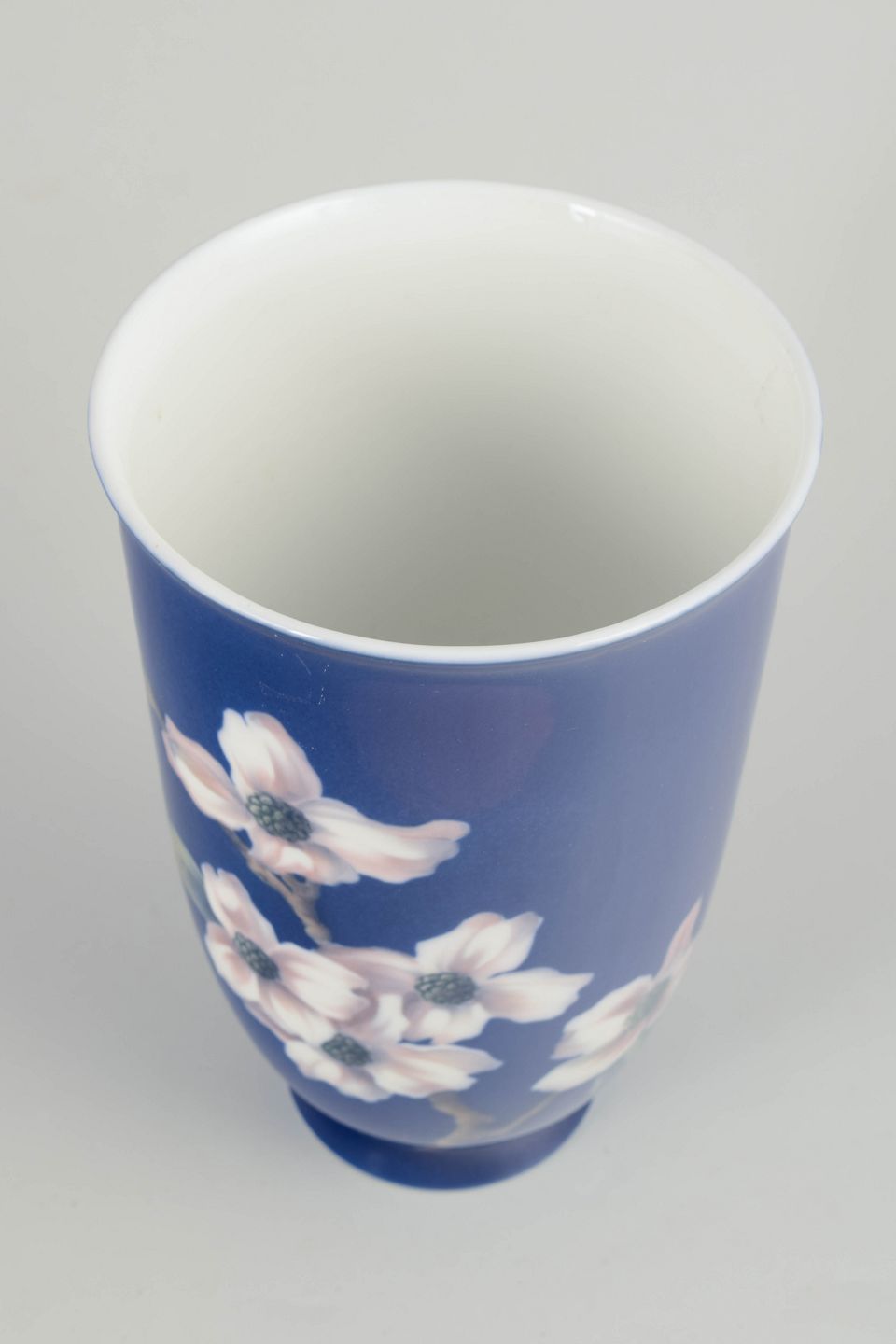 Høj, cylindrisk vase i glaseret porcelæn med dyb koboltblå bund og håndmalet underglasurdekoration af blomster i lyse rosa og hvide nuancer med fine grå detaljer. Den kontrastfulde dekoration fremhæver vasens enkle, oprette form og giver et klart, elegant udtryk.