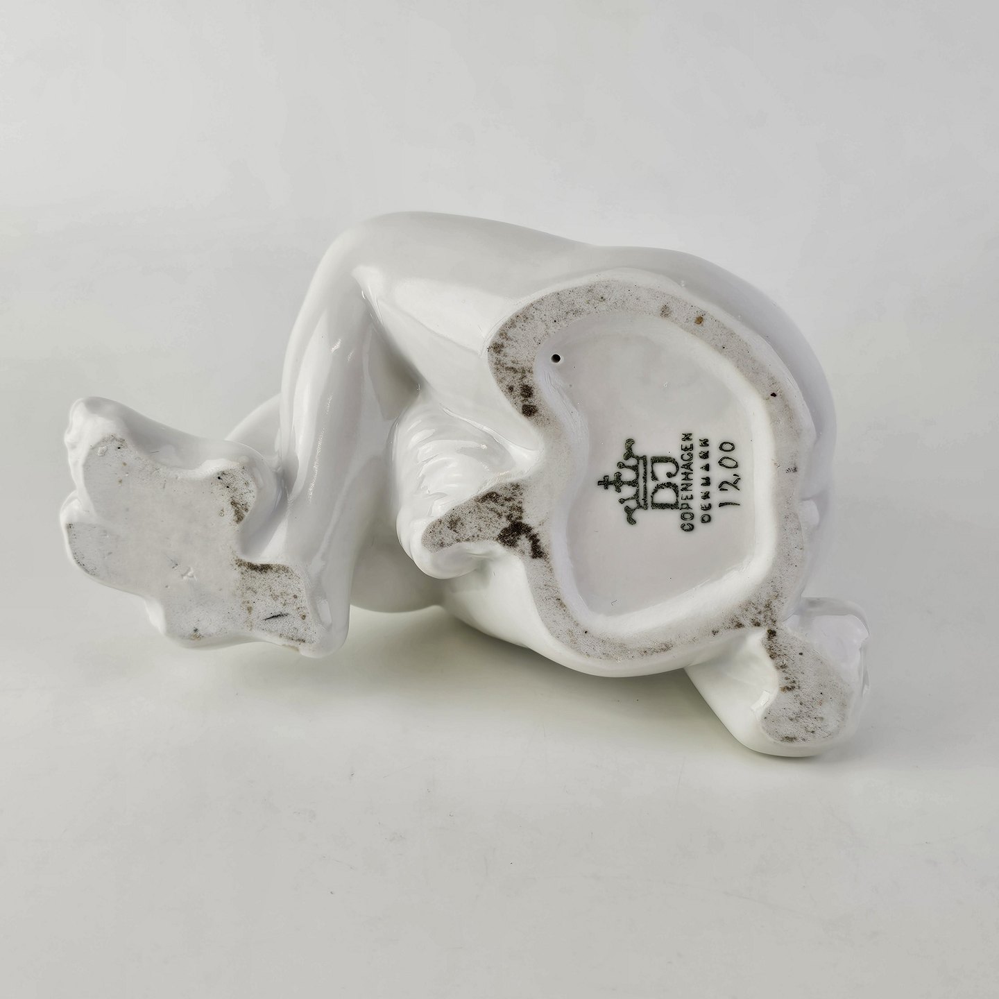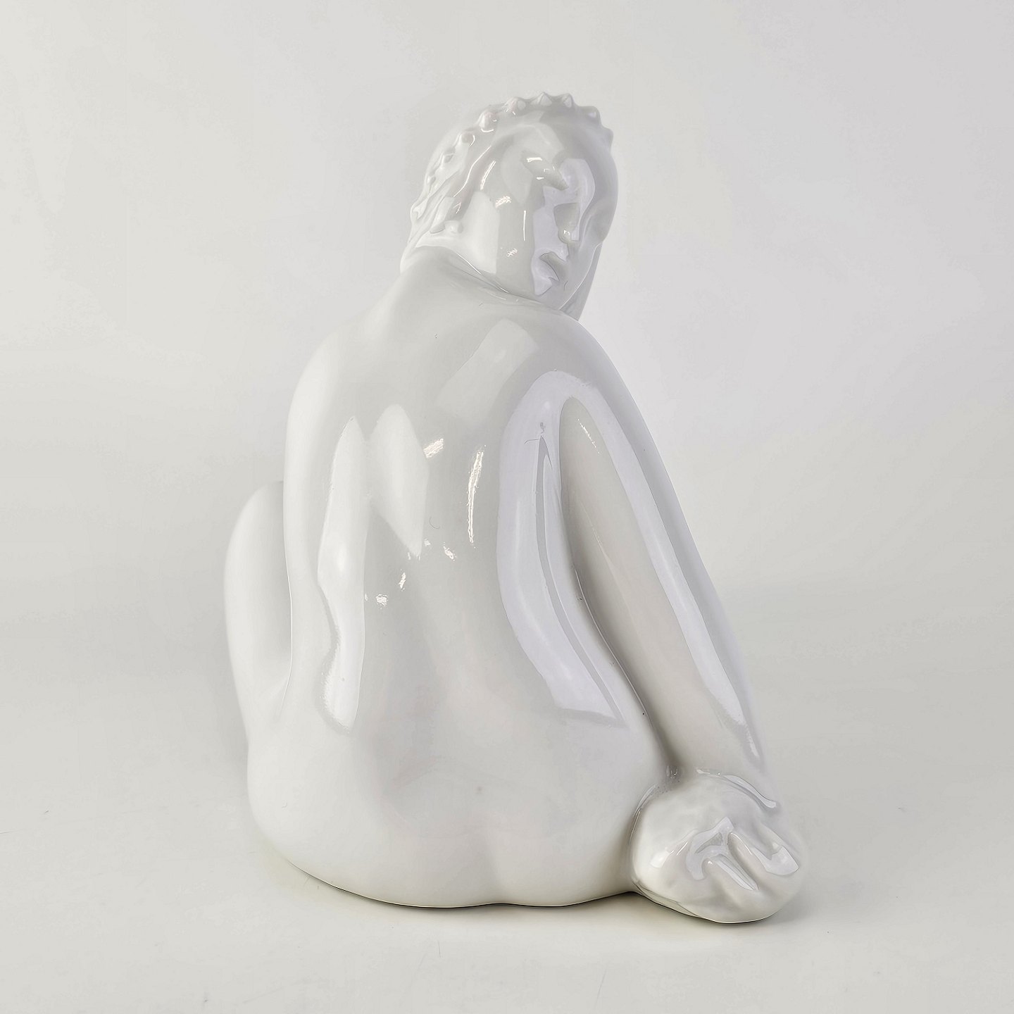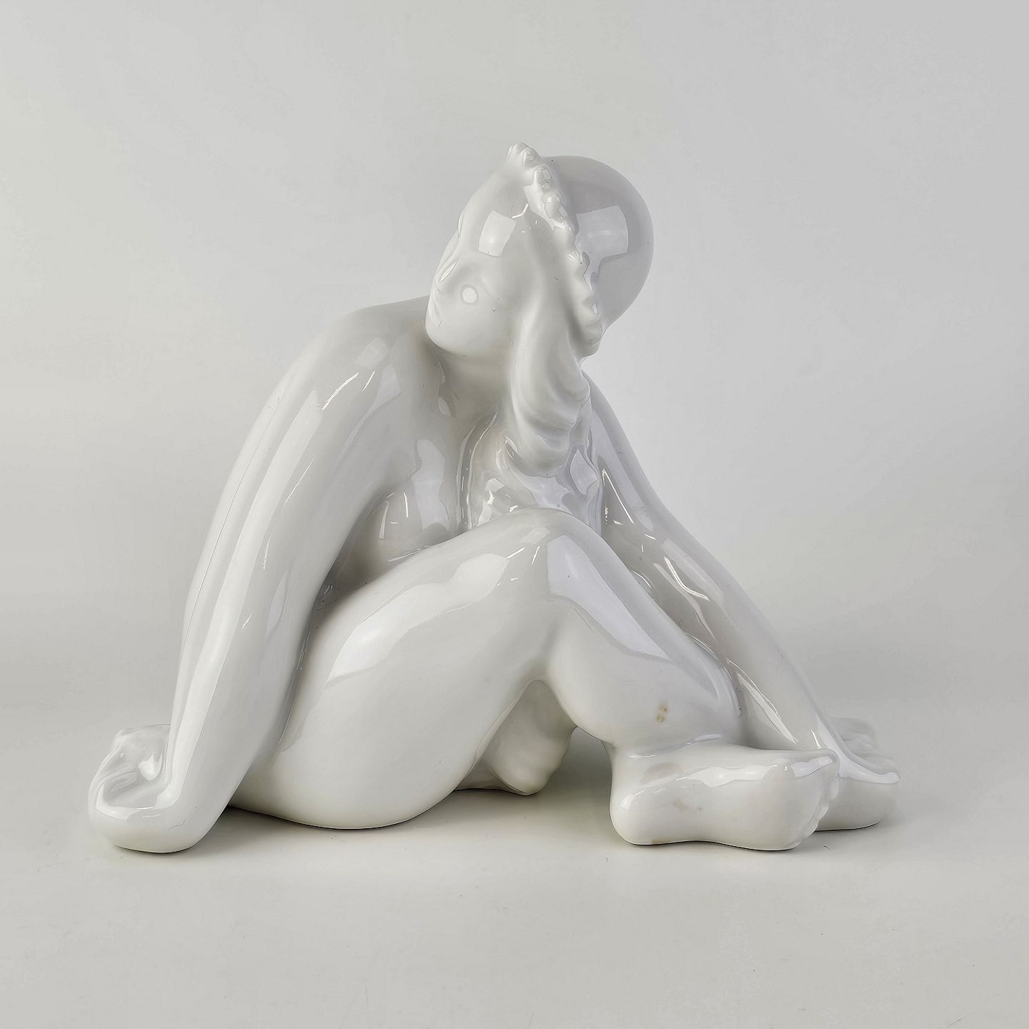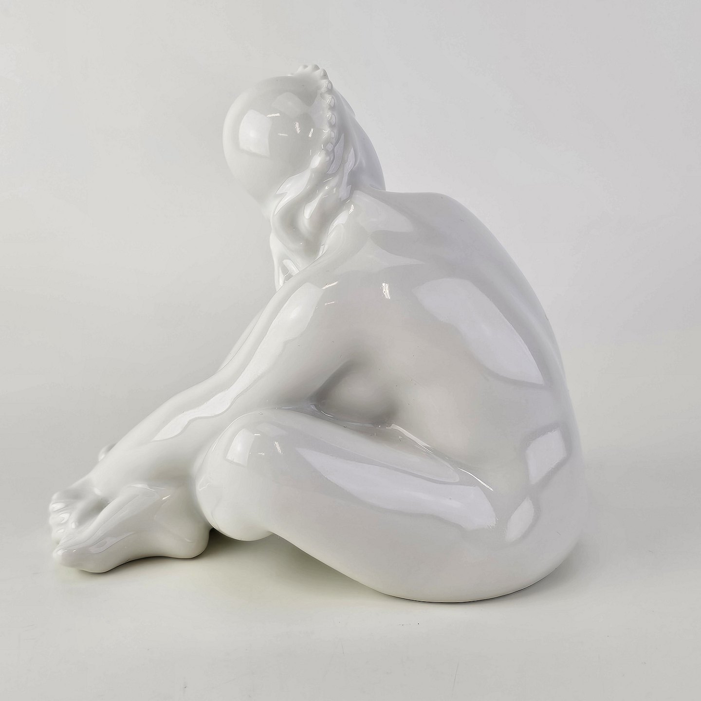 Figur i hvidt porcelæn med motiv af en siddende pige