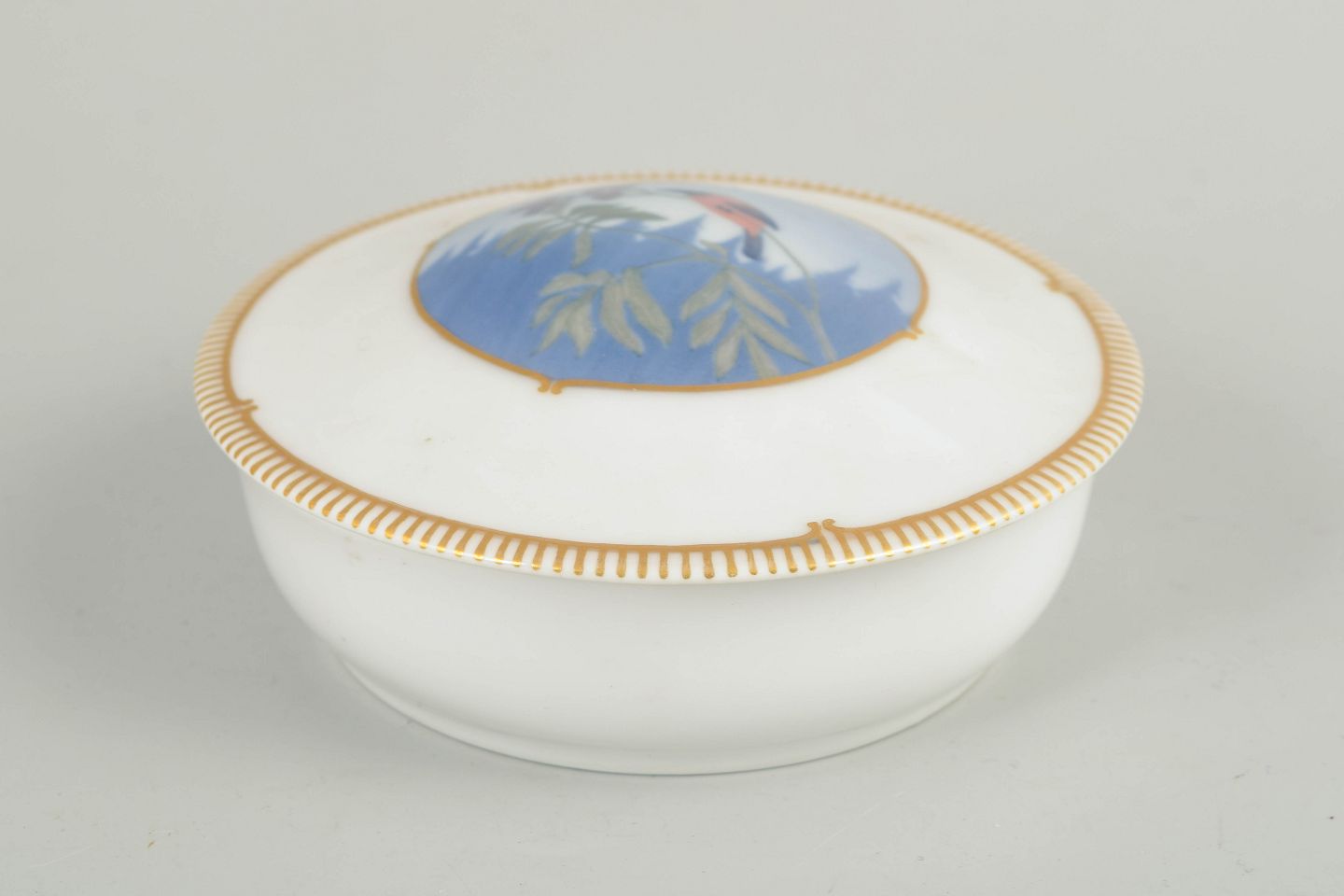 Art Deco lågskål i hvidglaseret porcelæn med bred guldkant og centralt felt med håndmalet fugledekoration i blå og grønne nuancer. 1. sortering. Model 1340/2.