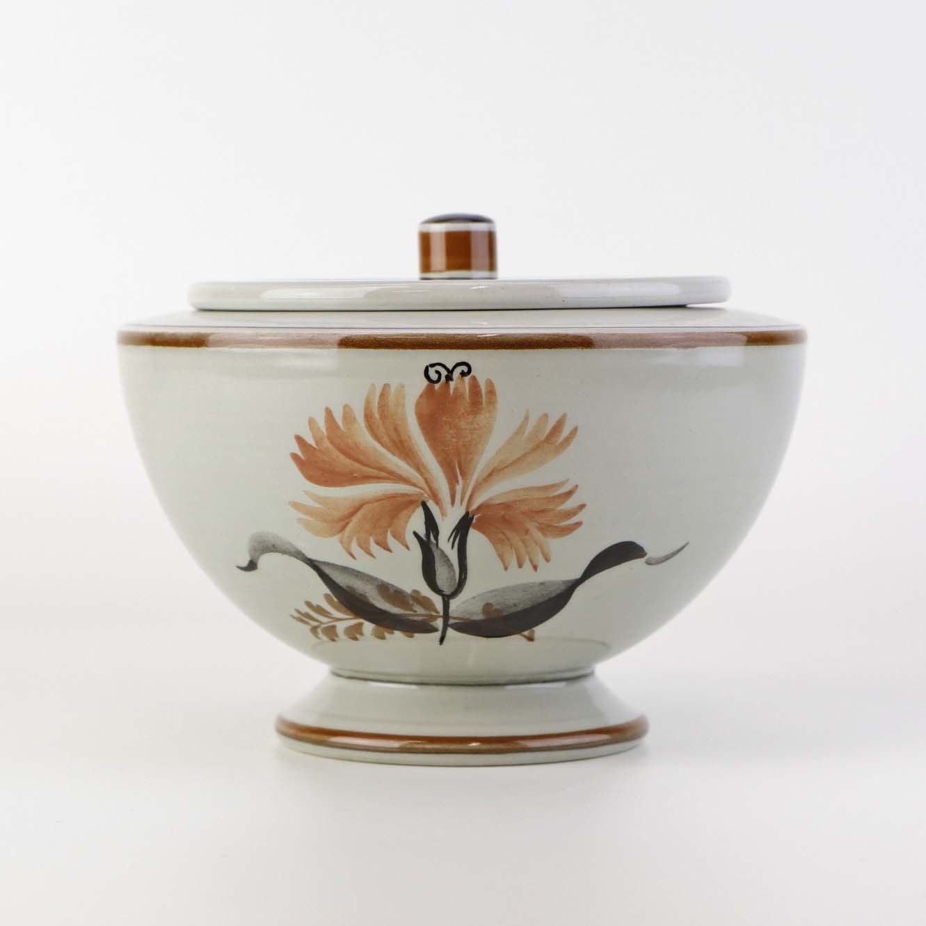 Fajancestellet er i stelformen Viktoria II med dekoration af orangebrune blomster på gråtonet baggrund med brun kant.