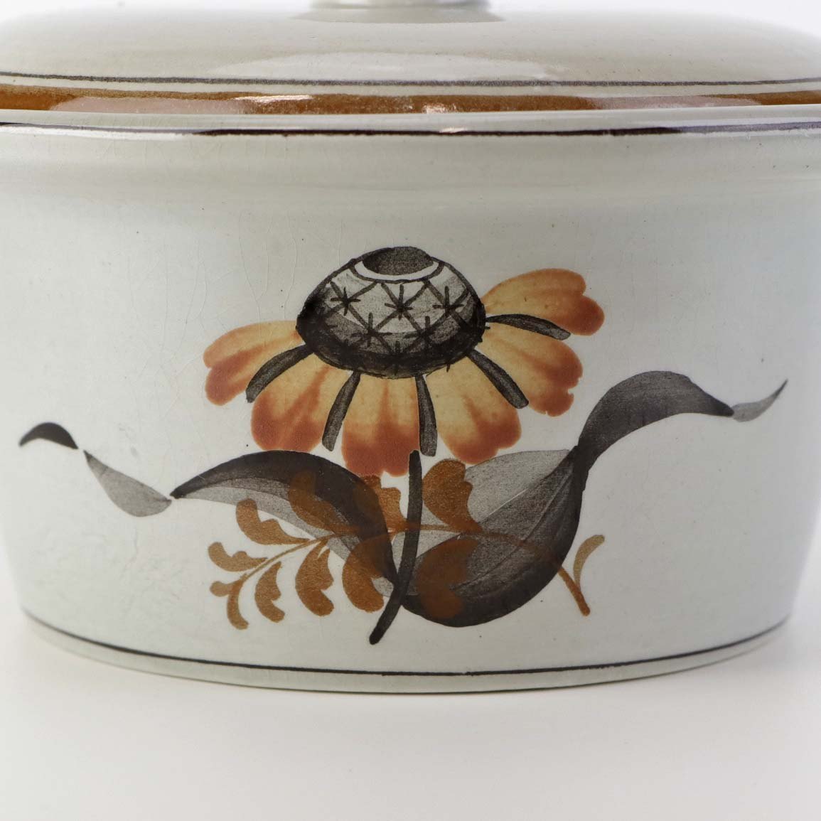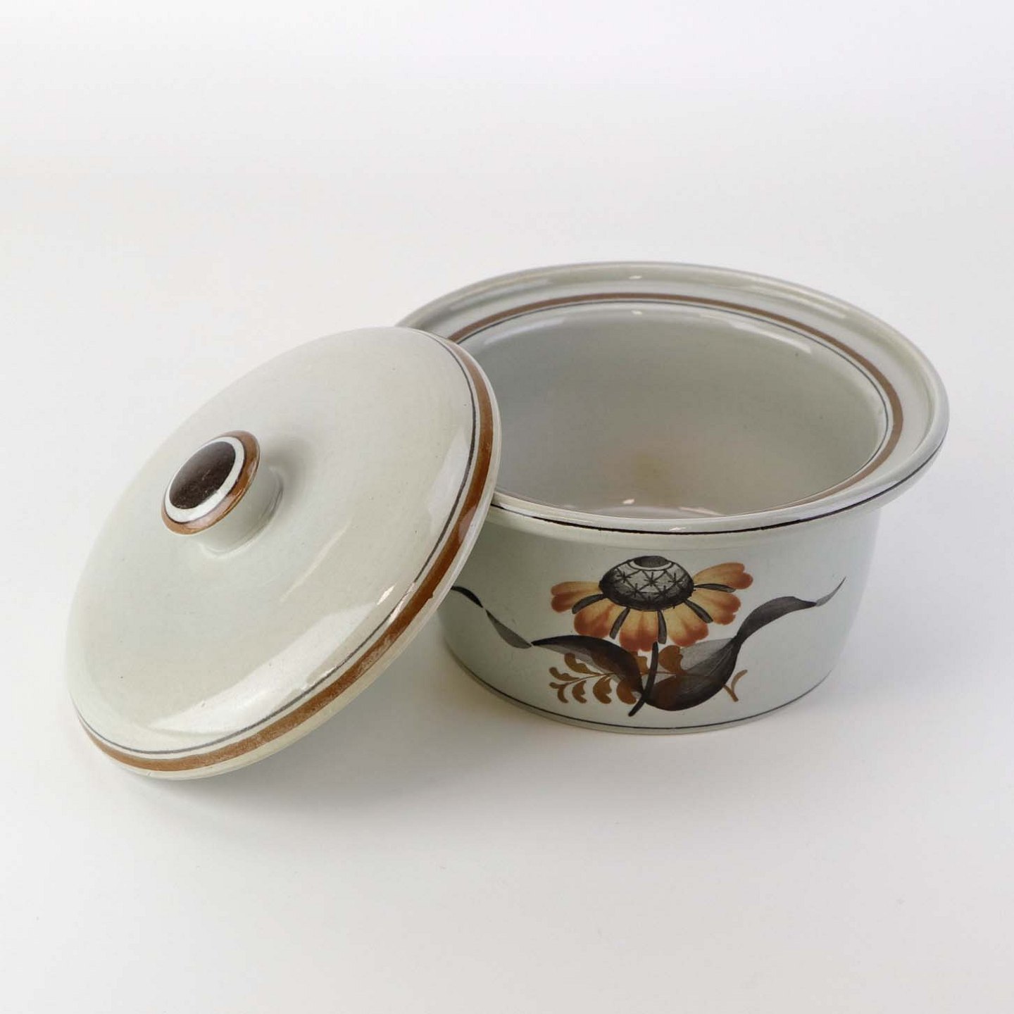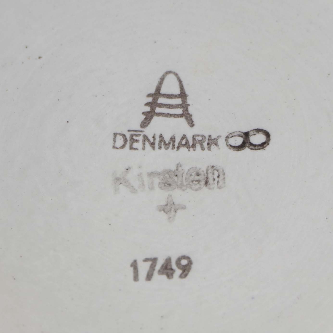 Smørskål med låg i fajance fra stellet Kirsten, som blev fremstillet i perioden 1934-1957. Nr. 1749