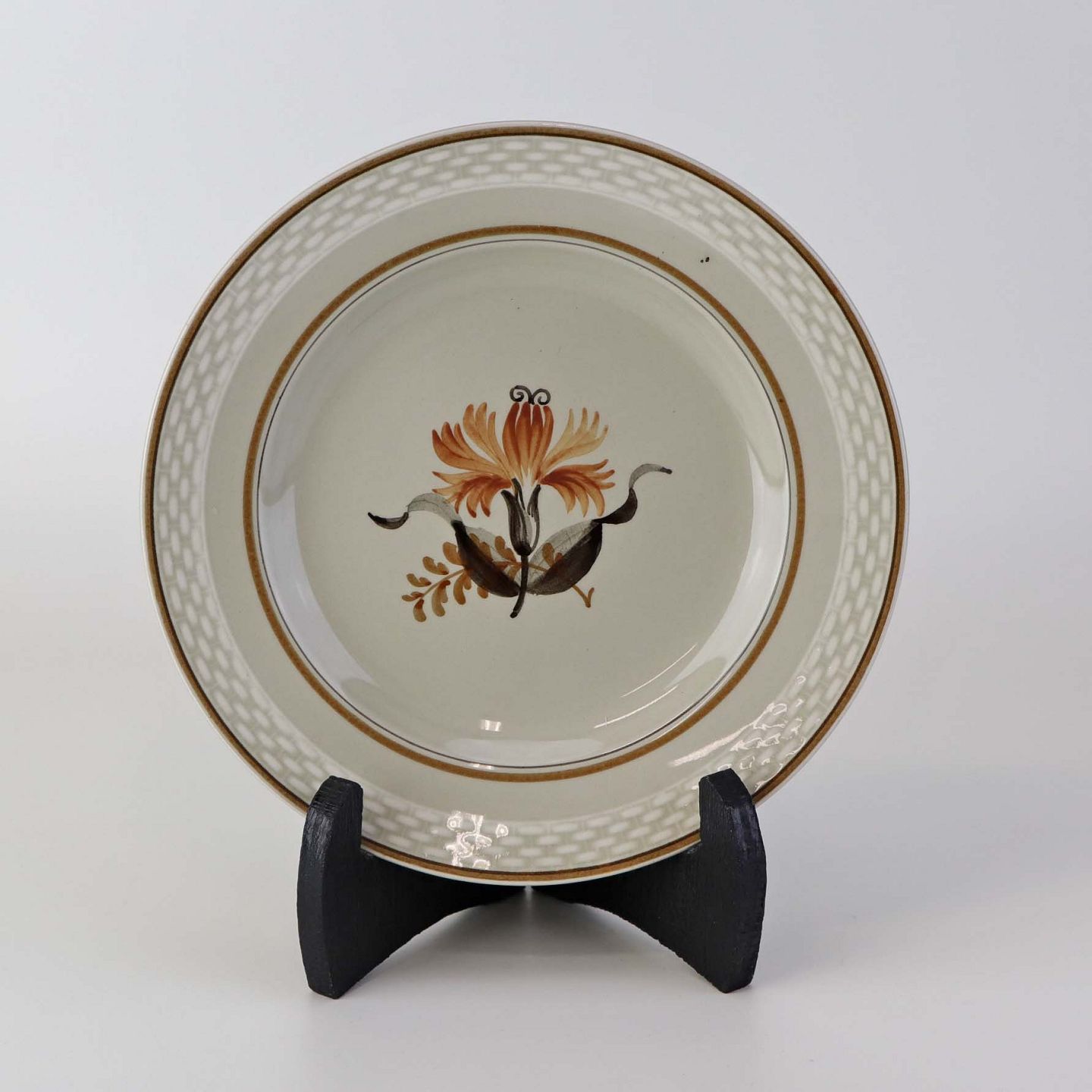Fajancestellet er i stelformen Viktoria II med dekoration af orangebrune blomster på gråtonet baggrund med brun kant.