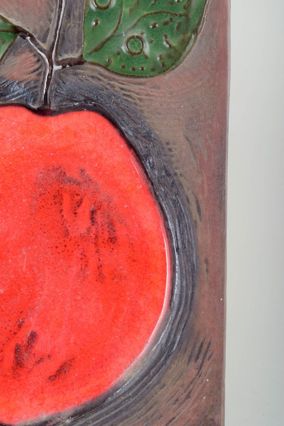 Stort, sjældent vægrelief i glaseret keramik med stiliseret frugtmotiv. Relieffet er domineret af et markant rødt frugtfelt med grønne blade mod en brunlig, struktureret baggrund, der understreger motivets plastiske virkning. Glasurerne er kraftfulde og levende og giver relieffet et tydeligt kunstnerisk og modernistisk udtryk. Modelnummer 1043E.