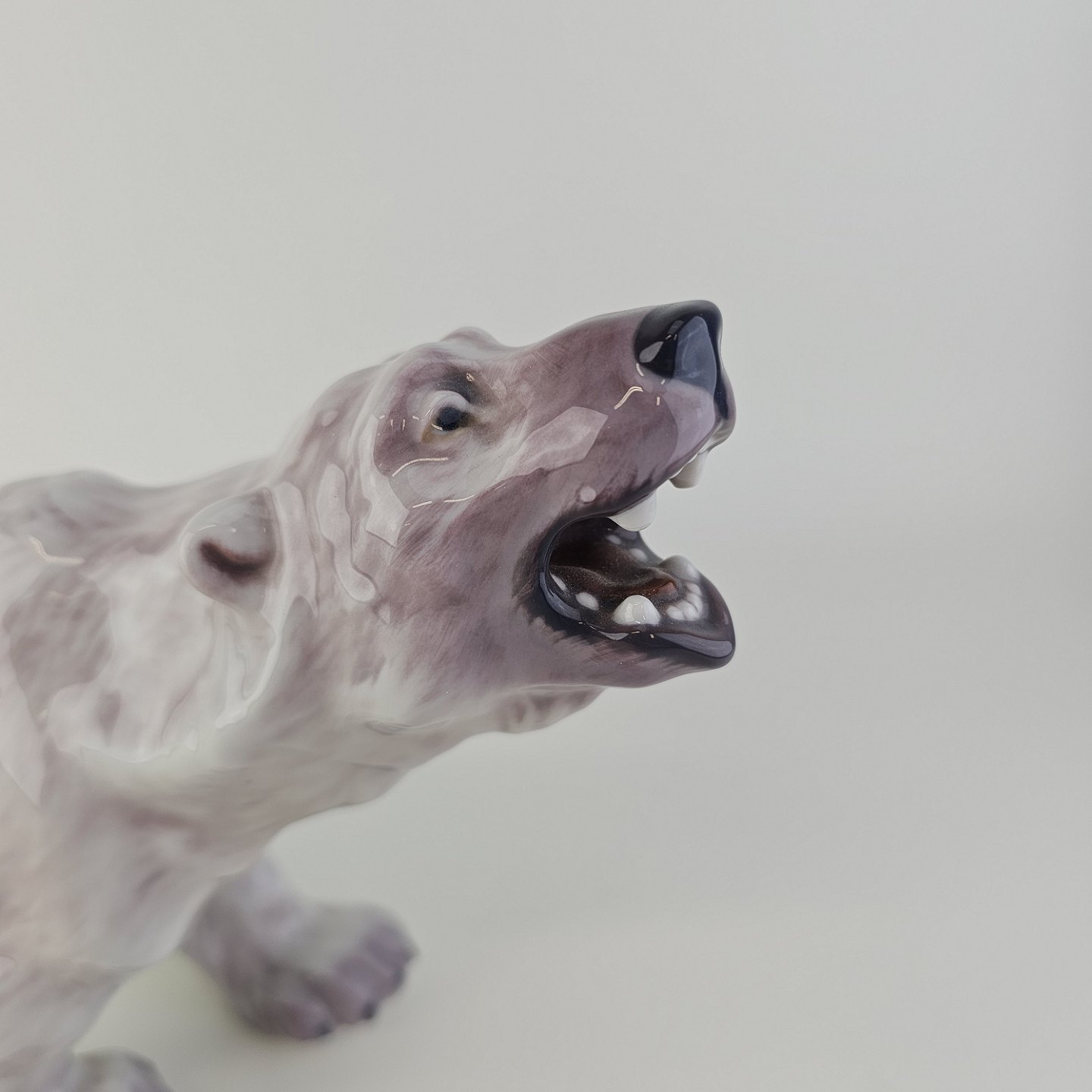 Figur i hvidt porcelæn med motiv af en brølende isbjørn
