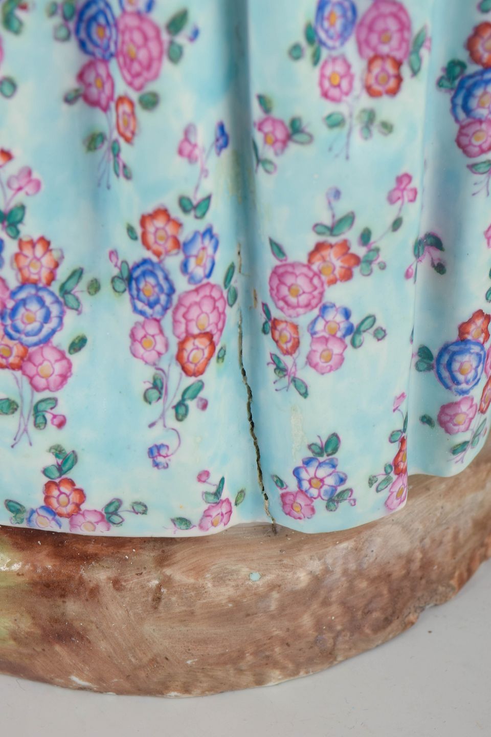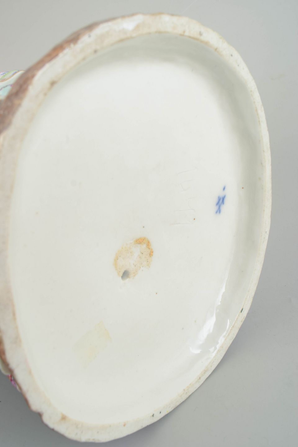 Stor Meissen porcelænsfigur fremstillet efter Jean-Étienne Liotards berømte motiv “La Belle Chocolatière” (1744). Figuren forestiller en kvinde i 1700-talsdragt med serveringsbakke og kop, rigt bemalet med polykrome blomsterdekorationer, fine ansigtstræk og detaljeret staffering. Udført efter model nr. 1471 og forsynet med Marcolini-mærke, dateret til ca. 1790’erne.
