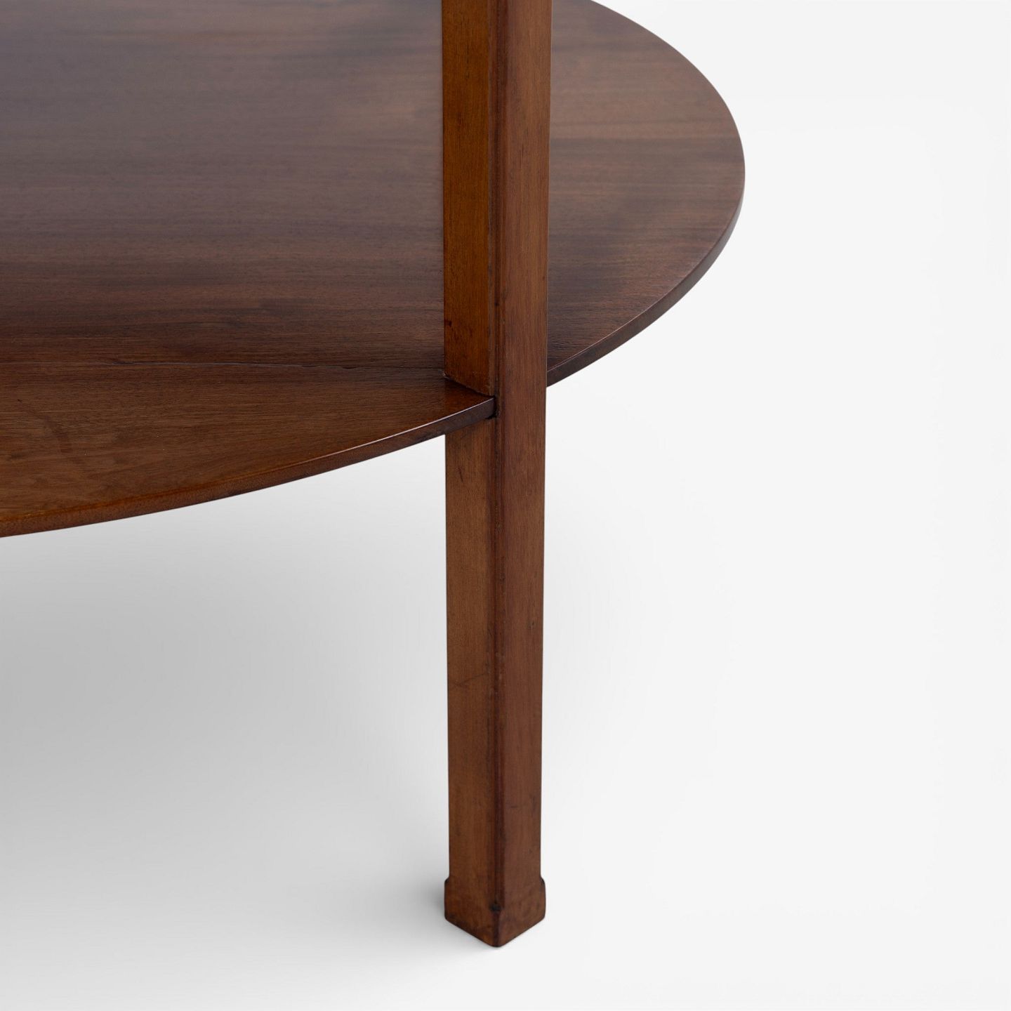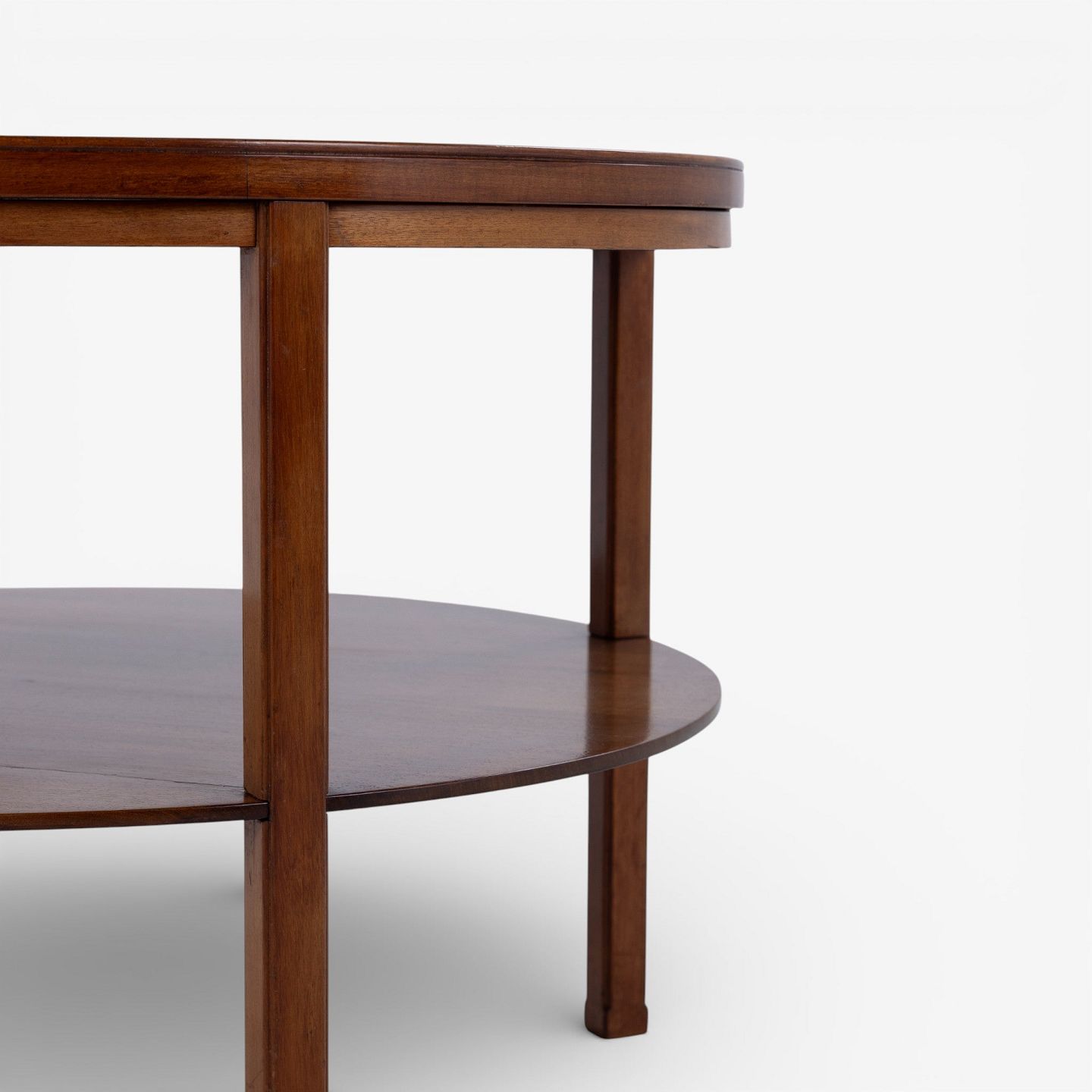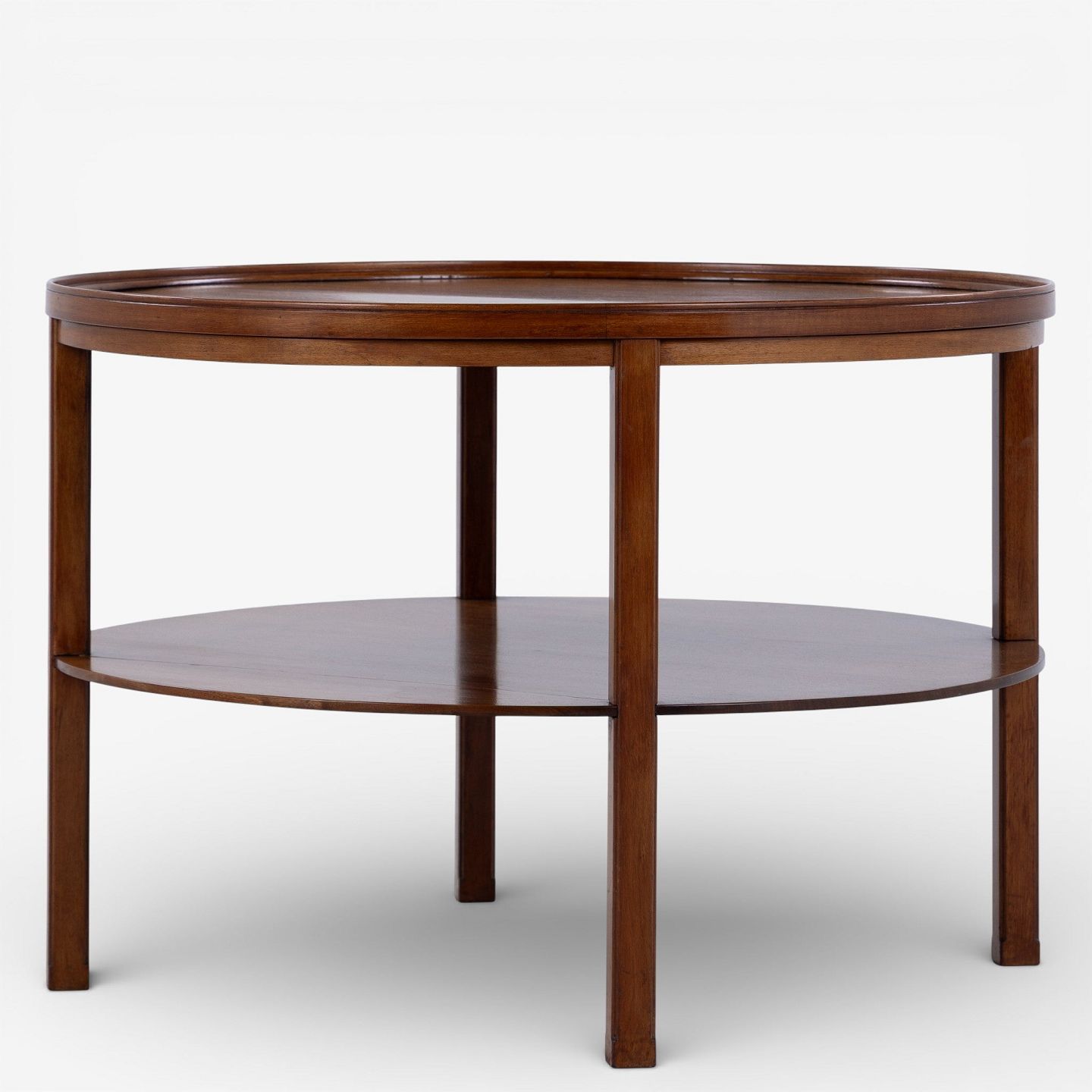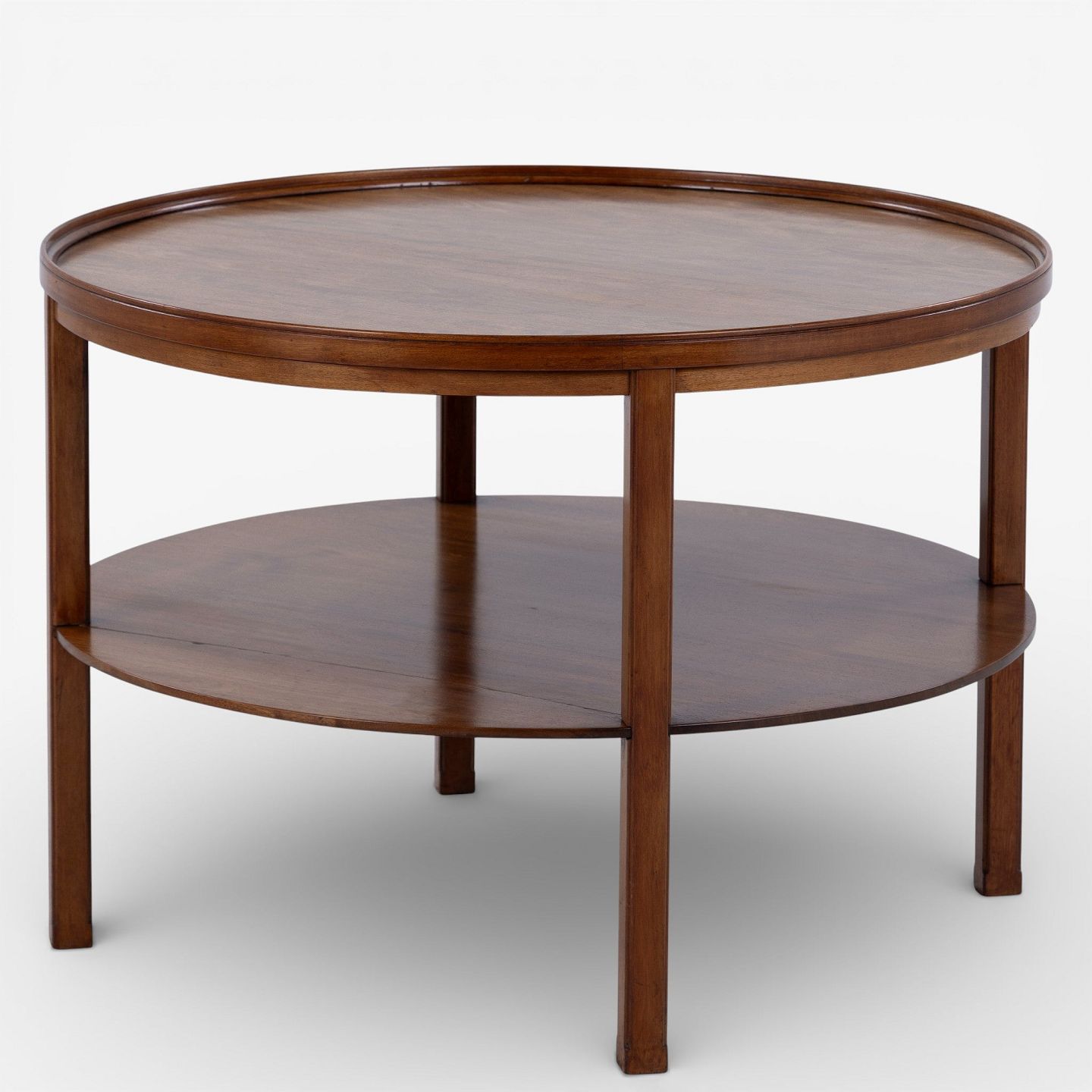 Rundt sofabord i patineret mahogni m. underliggende hylde. Mærket fra producent.