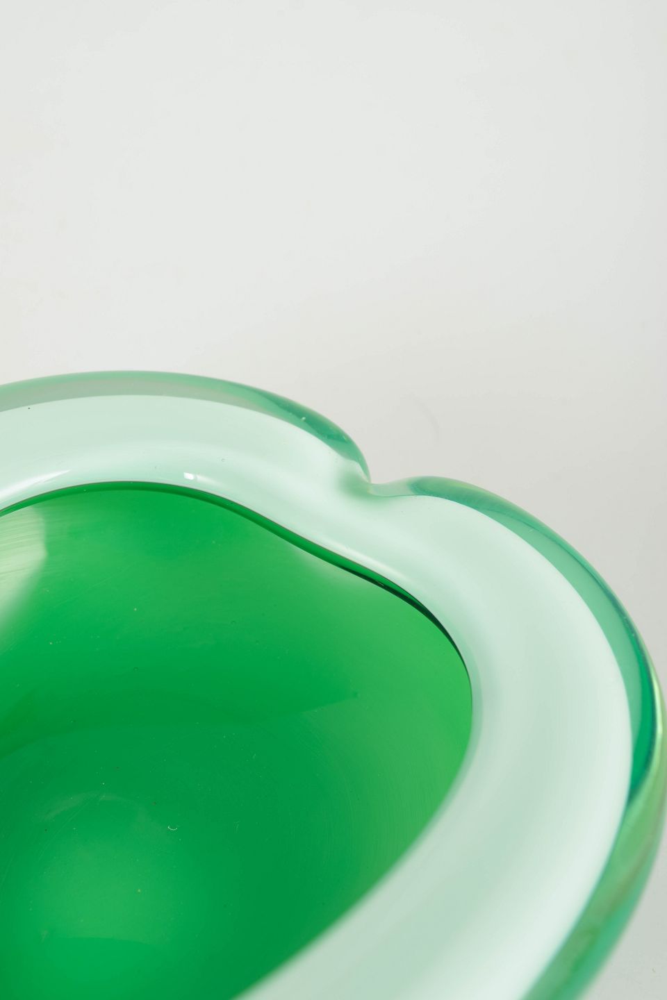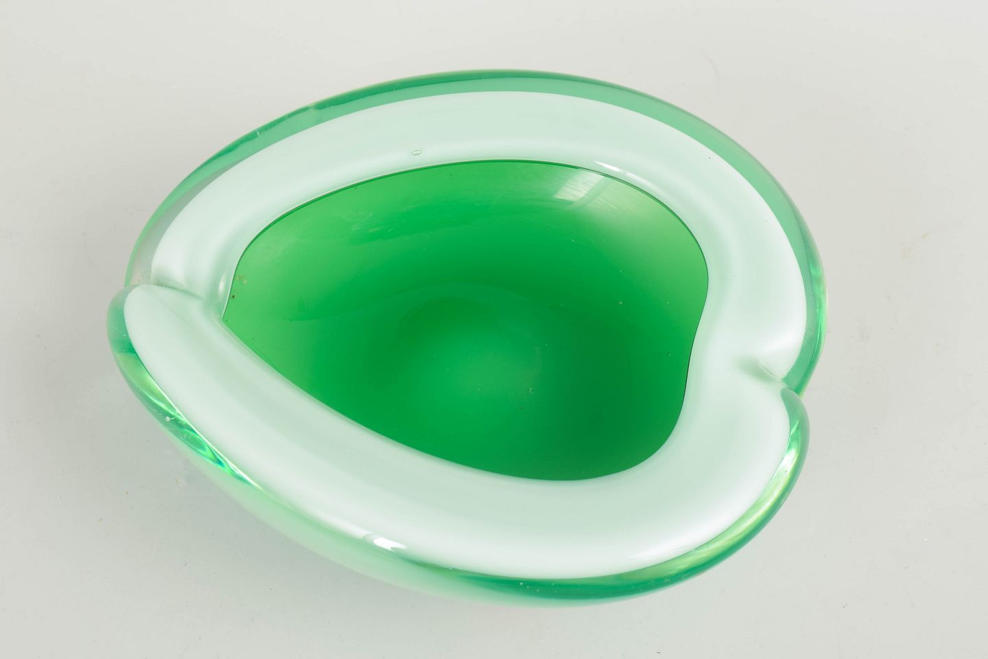 Lav skål i formblæst opalhvidt og grønt glas med organisk, asymmetrisk form og poleret overflade; med original Vetro Artistico Murano-etiket.