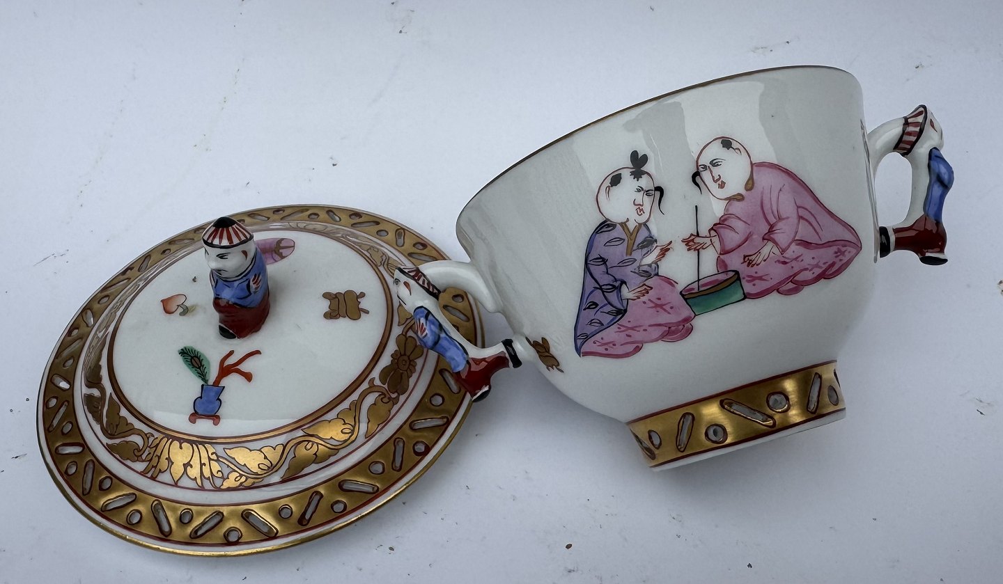 Herend lågskål i porcelæn fra Ming serien. Delikate kinesiske bemalede dekorationer samt figurer. Gennembrudte kanter. I perfekt stand. Fremstillet på den ungarnske porcelænsfabrik Herend i 1930’erne. Mål: H. 8,5 cm. Fra øre til øre 9,3 cm. Lågets diameter 8,6 cm. Bundens diameter 3,2 cm
