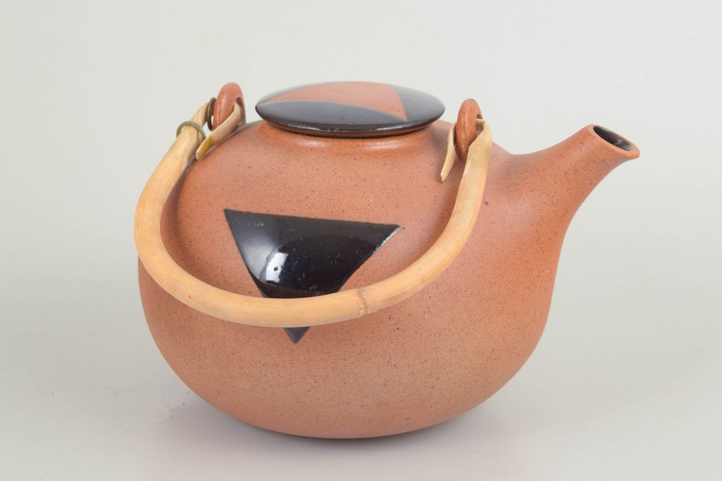 Sjælden tepotte i stentøj med mat, varm orange/sandfarvet glasur og markant sort, trekantet dekoration på korpus. Udstyret med sort låg samt høj bøjlehank, som giver en skulpturel silhuet. Model 332.