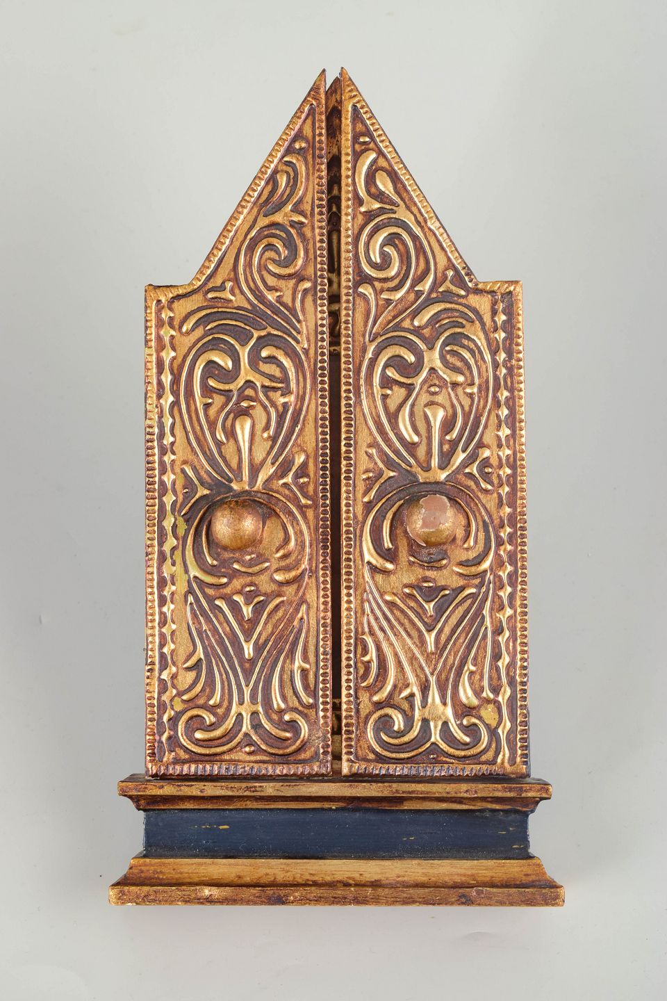 Foldbart triptykon med centralt ikonmotiv af Madonna med Barn, flankeret af helgenfigurer på sidefløjene. Udført som maleri på træ med forgyldt og ornamenteret ramme.