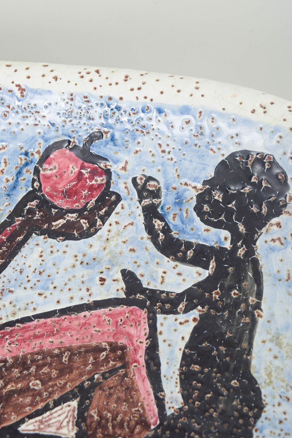 Unikt figurativt vægrelief i glaseret stentøj med stiliseret mor- og barnemotiv udført i kraftige jordfarver og kontrasterende konturtegning.