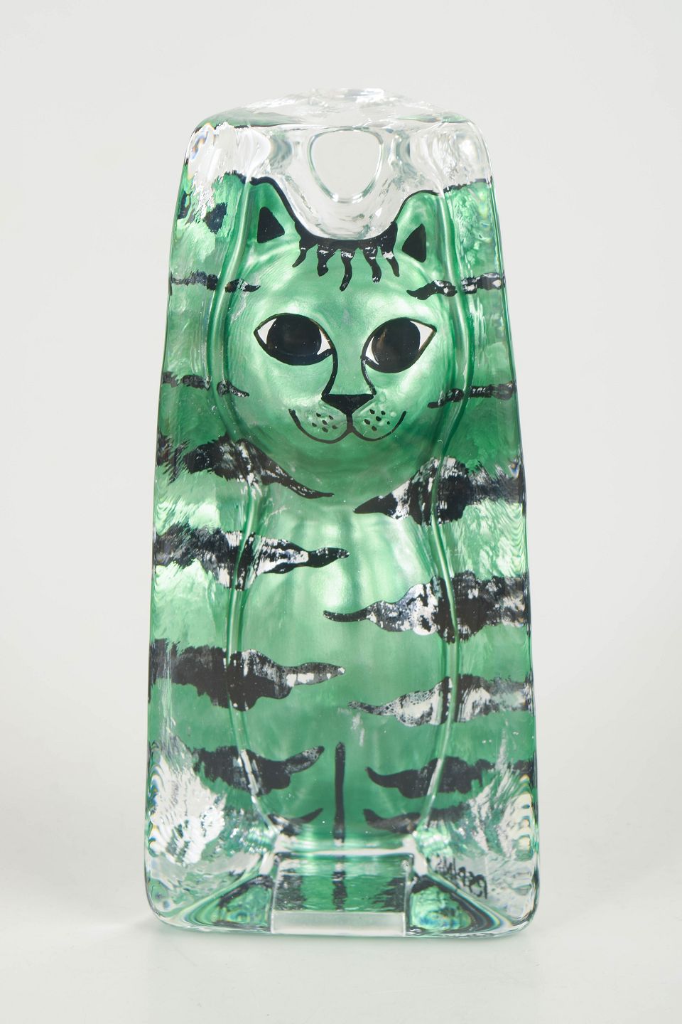Mundblæst glasfigur i klart glas med indkapslet grønt kattemotiv, håndmalede detaljer og model udført i reliefform inde i glasset.