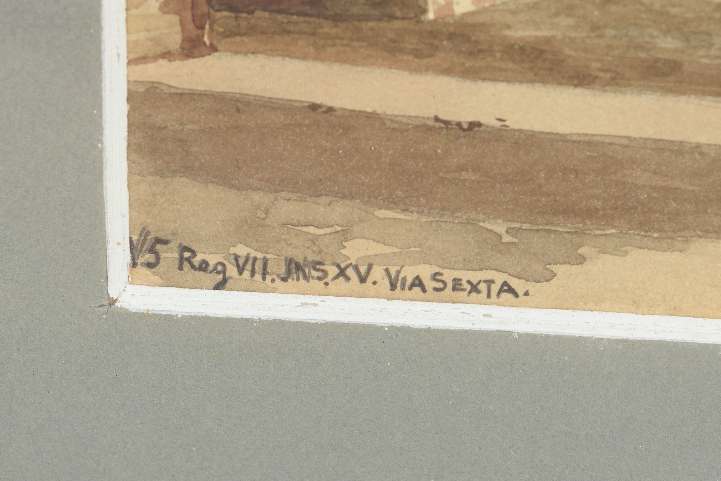 Arkitektonisk motiv fra Pompeji med klassiske bygningsfragmenter og rumlige perspektiver, udført som akvarel i dæmpede jordfarver og varme okkertoner. Signeret og dateret, Pompeji 1905.