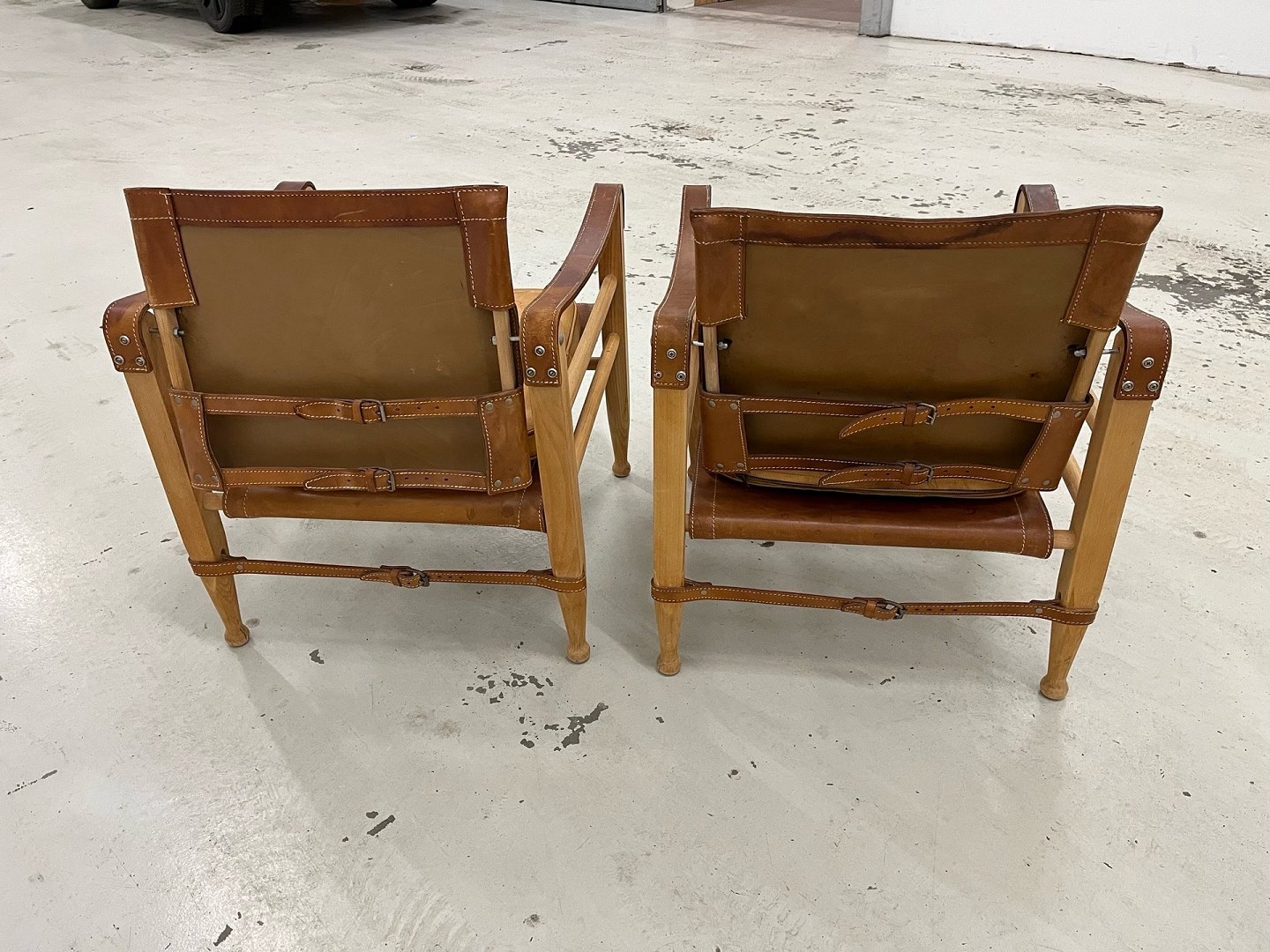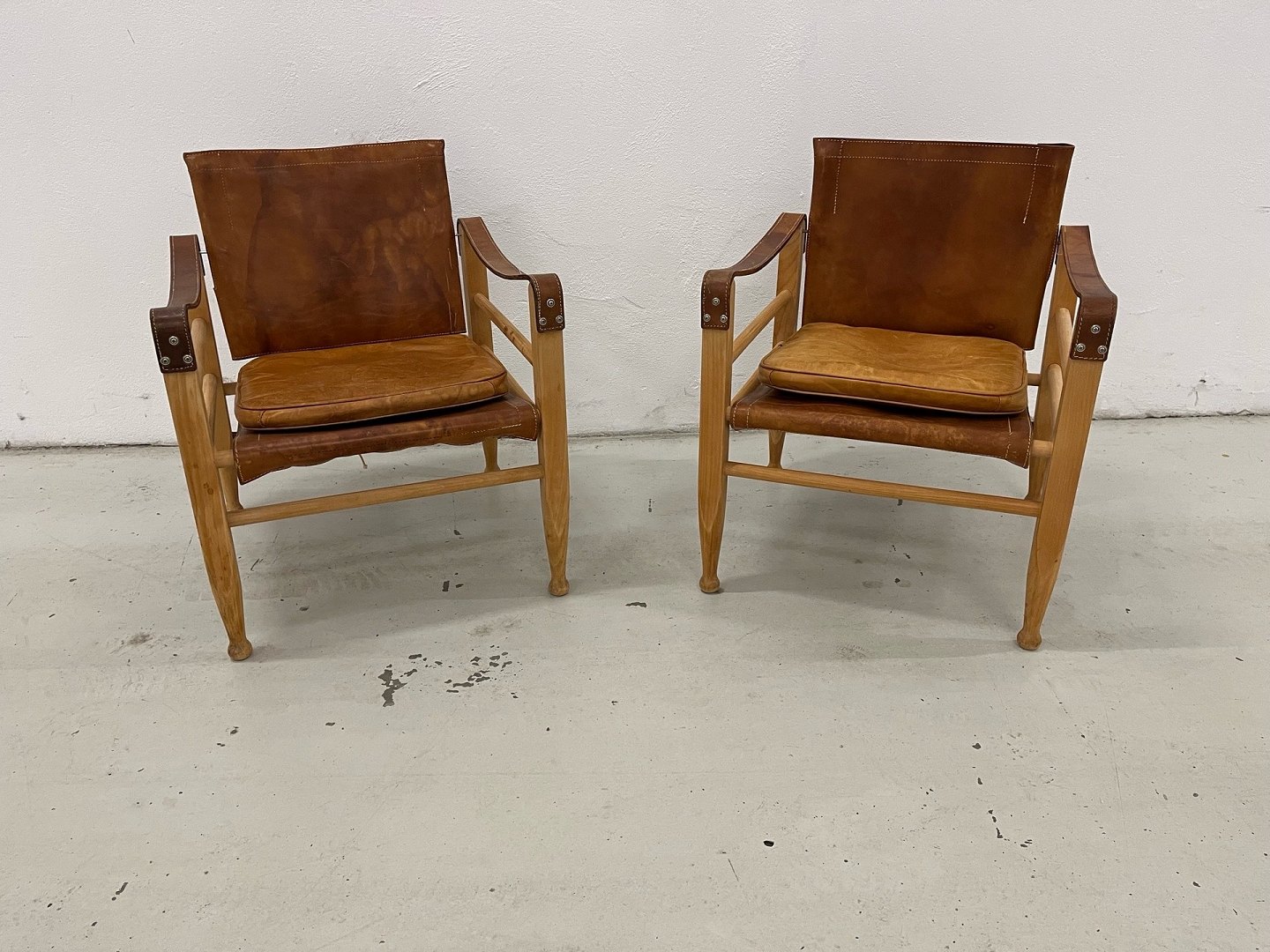 Et helt unikt og særdeles velbevaret sæt safaristole designet af Aage Bruun & Søn fra 1960’erne. Stolene er udført med stel i massivt bøgetræ samt sæde, ryg og armlæn i cognacfarvet, patineret kernelæder. Læderet fremstår smukt patineret, og både spænder, stropper og stel er i fuldstændig original og fejlfri stand.
