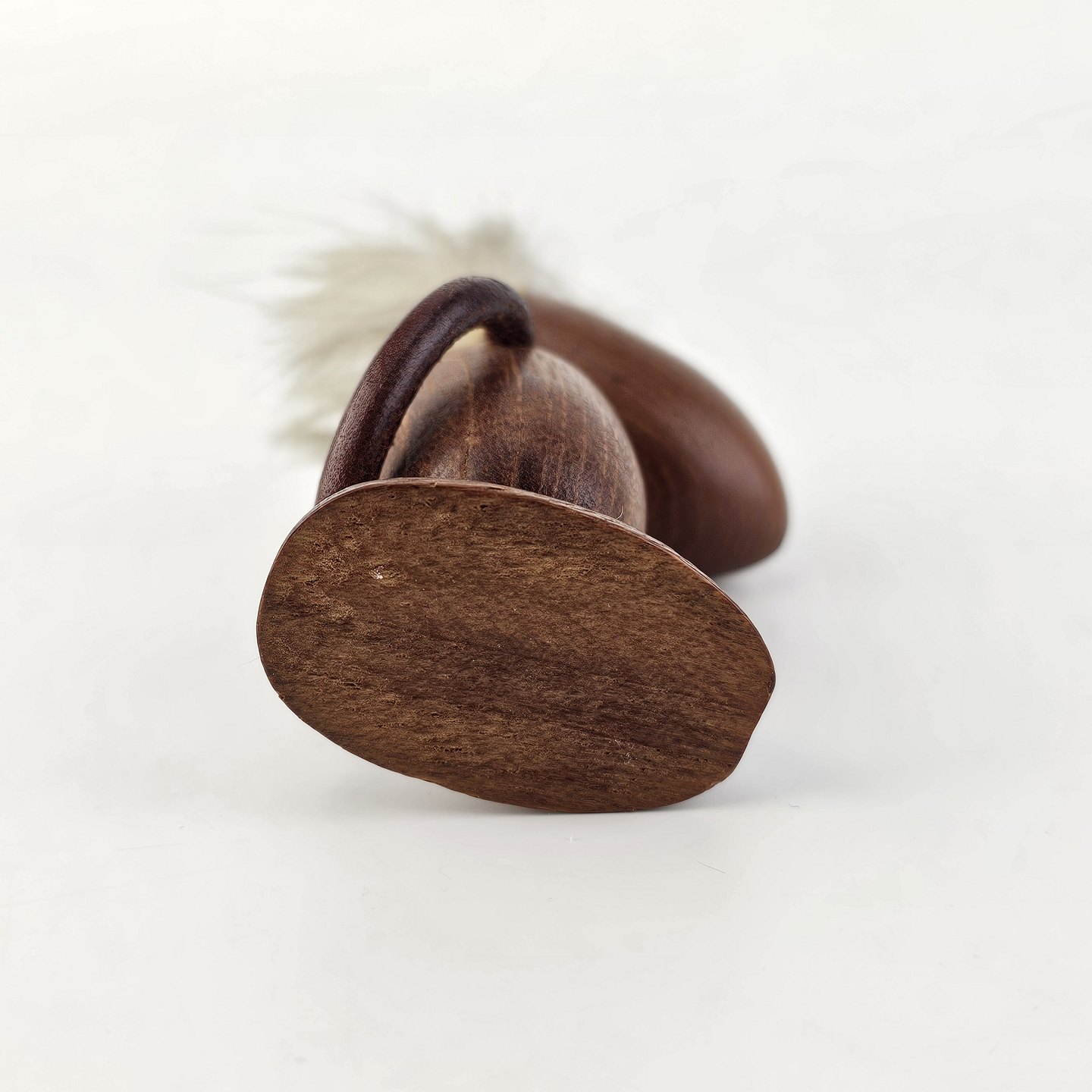 Håndskåret figur af teak med gråt hår og arme af læder. Fra 1960'erne