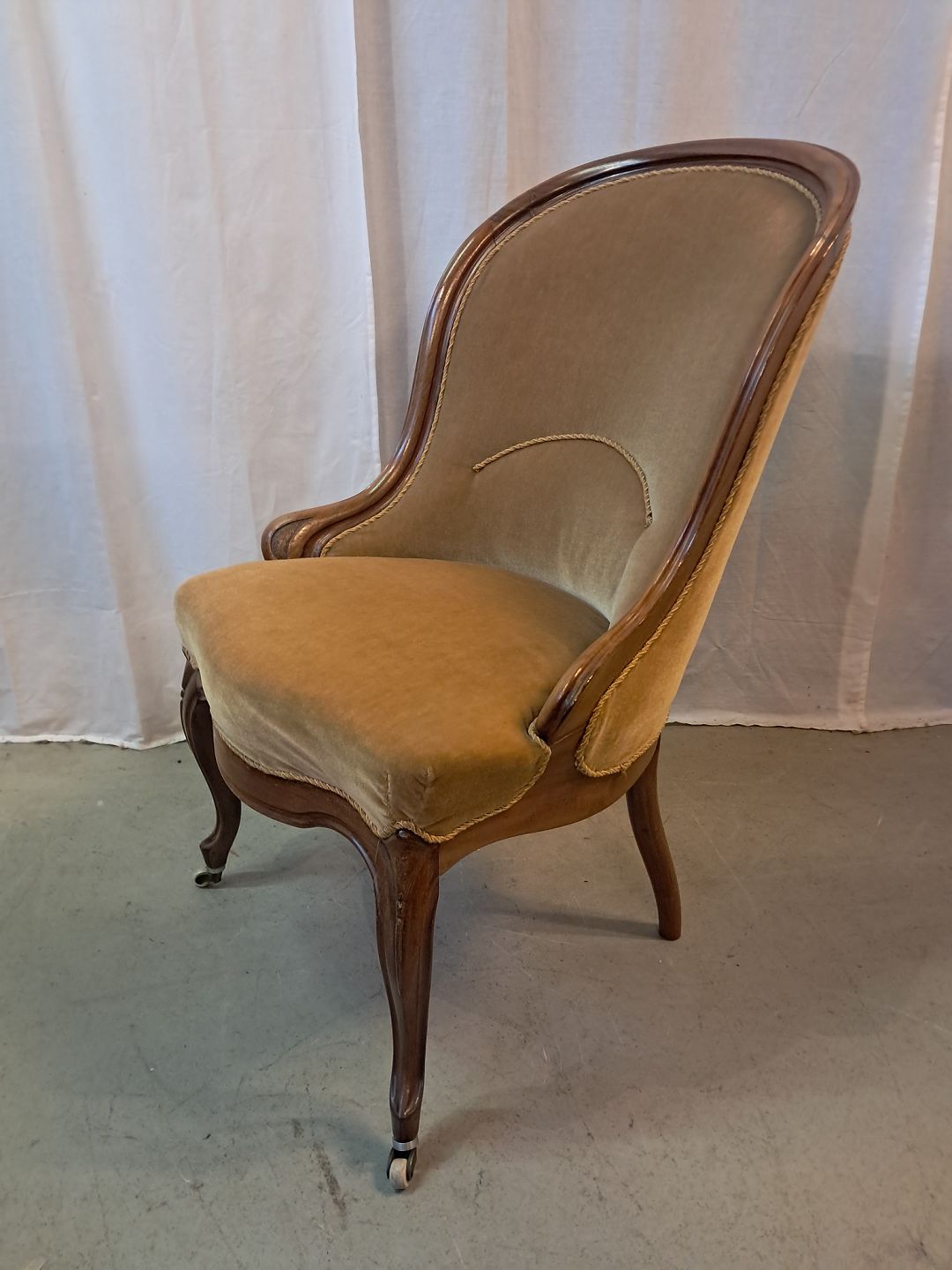 Lænestol i mahogni med velour betræk, fra 1900erne.
