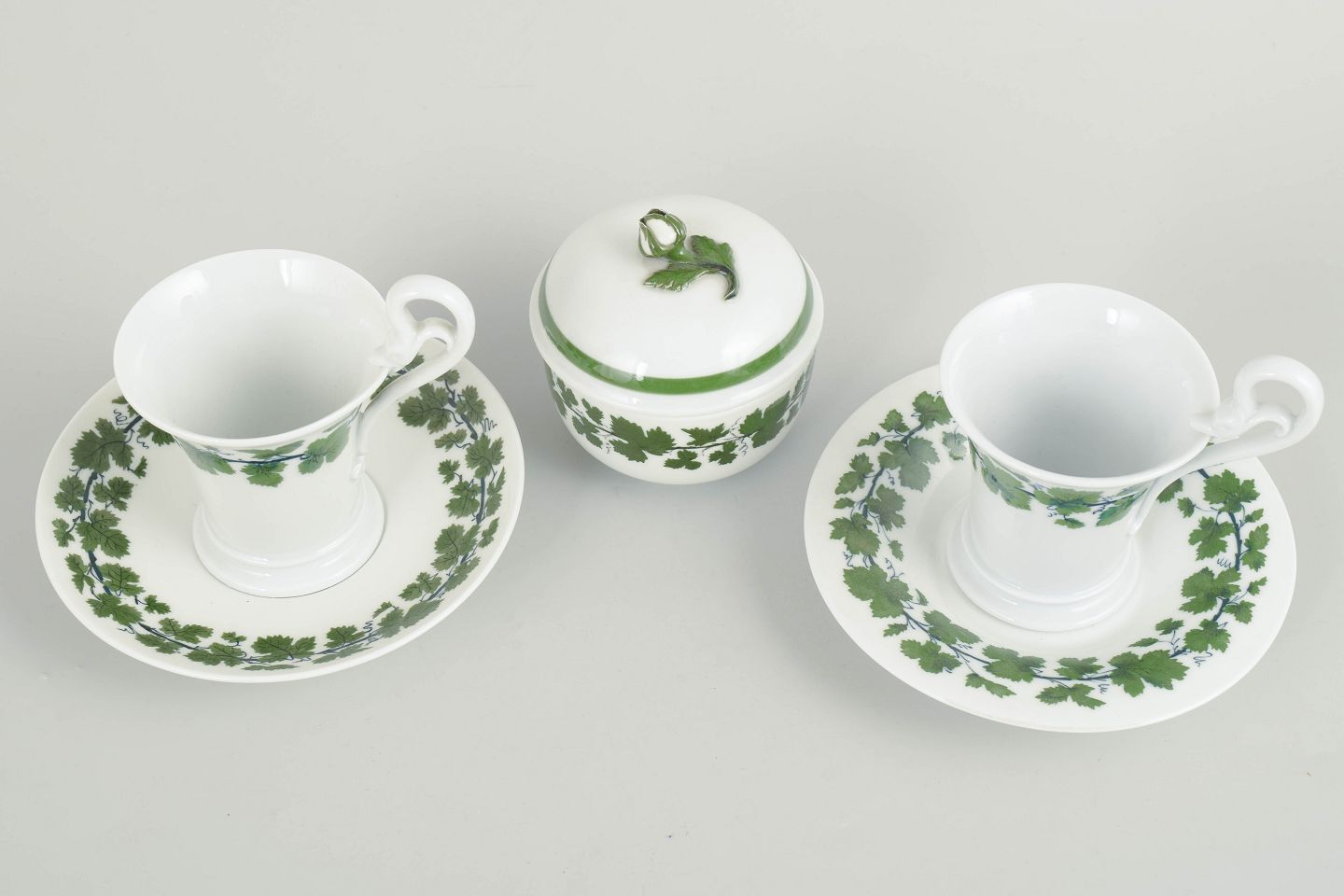 Et par kaffekopper med svanehank og tilhørende underkopper samt sukkerskål i porcelæn, dekoreret med grøn vinløvsbort. Nogle dele i første sortering, andre annulleret med to indridsede streger. Mærket med Meissens krydsede sværd.