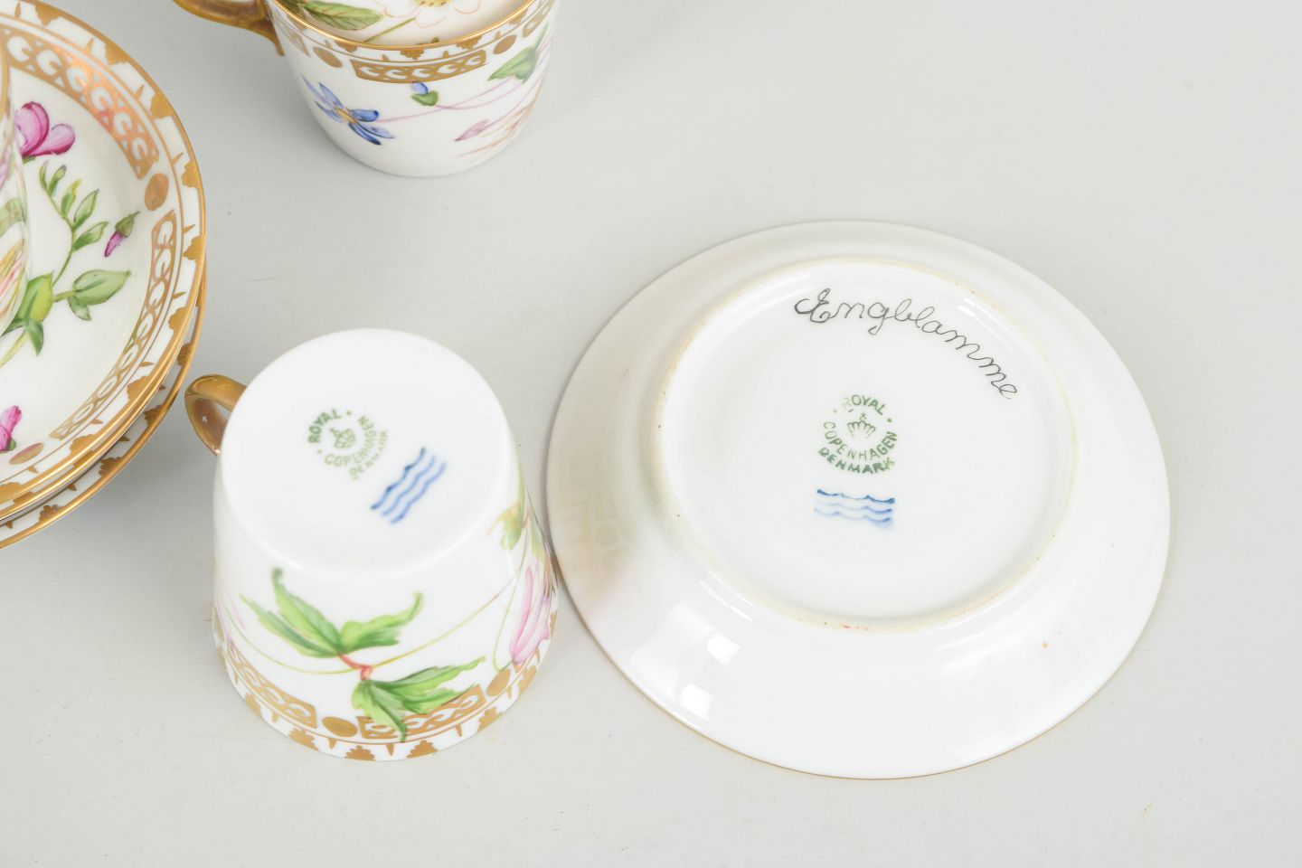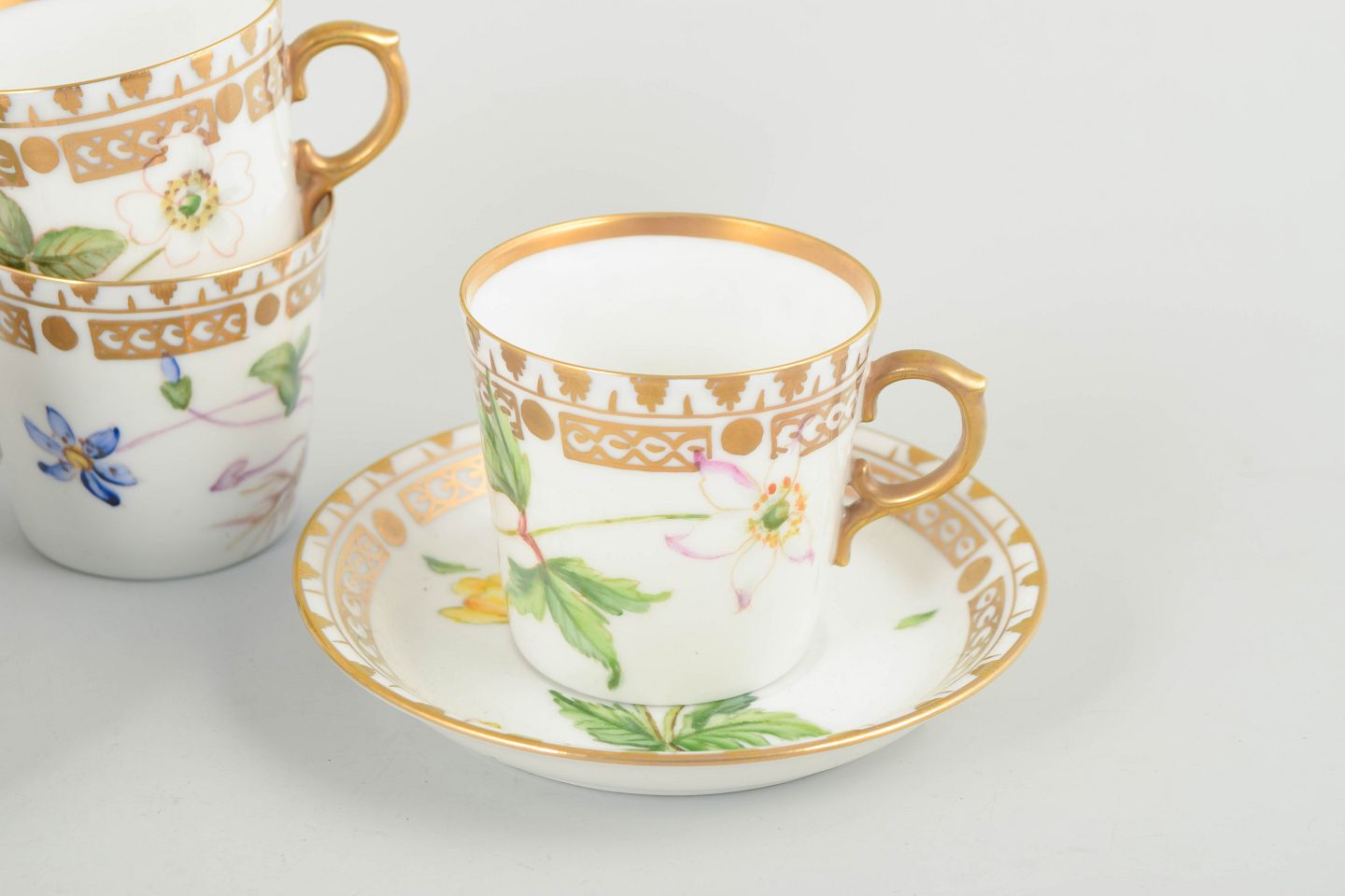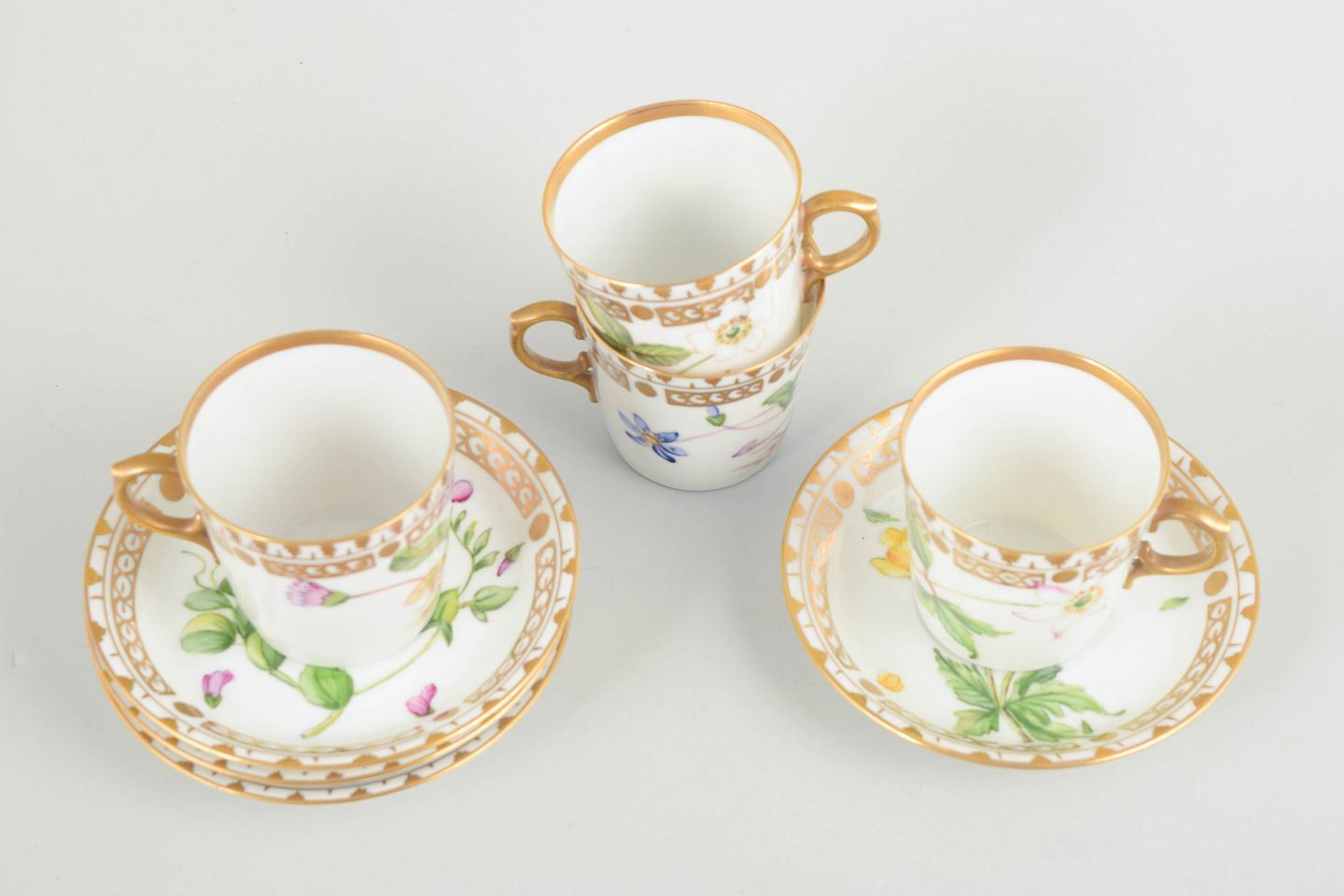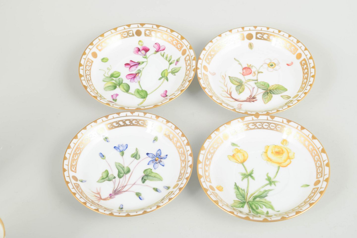 Porcelain in Flora Danica style with hand-painted botanical motifs and gilt rims.